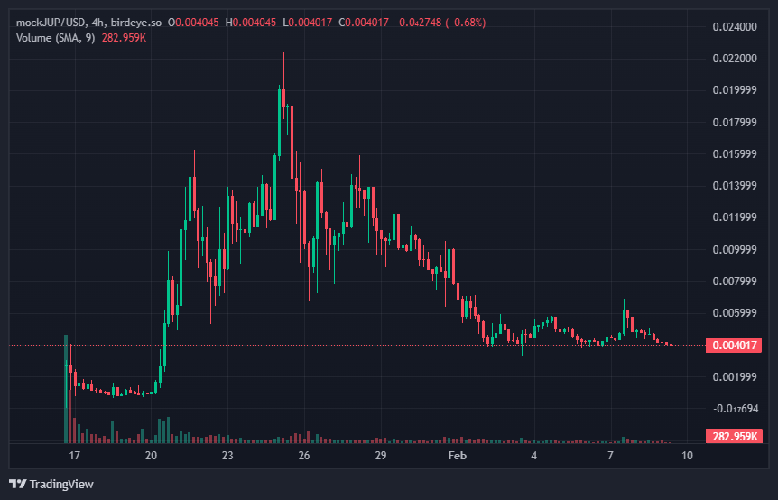 Der erste Token mockJUP ("Pseudo-JUP") sollte zur Erprobung des Airdrop-Mechanismus dienen. Am 16. Januar verteilte das Team die Token an aktive Solana-Nutzer. Innerhalb weniger Minuten erstellen Teilnehmer einen Liquiditätspool und die laut dem Gründer Meow "wertlose Testmünze" konnte auf dezentralen Börsen gehandelt werden. Das Team selbst stellte keine Liquidität bereit, um Anschuldigungen eines Betrugs souverän abwehren zu können. Dass Nutzer auf den Preis von mockJUP spekulieren werden, war allerdings vorhersehbar. Kurzzeitig handelte die Testmünze auf einer Marktkapitalisierung von über 200 Mio. USD. Seit dem Höchststand ist der Preis um -80% eingebrochen.