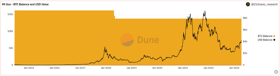 Die Rückzahlung der Vermögenswerte von Mt. Gox (ca. 142k BTC, ca. 143k BCH und 69 Mrd. JPY) an die Gläubiger wird an den Kryptomärkten seit langem erwartet, wobei die Rückzahlungen voraussichtlich bis zum 31. Oktober 2023 erfolgen werden. Die letzten aufgezeichneten Abflüsse des Mt. Gox-Treuhänders fanden im April bis Mai 2018 statt und beliefen sich auf ungefähr 24.22k BTC im Wert von rund 219 Mio. USD zum Zeitpunkt der Überweisungen. Wir konnten bei Dune Analytics 137'891 BTC im Wert von 4.13 Mrd. USD bis zum 12. April 2023 verfolgen, die dem Mt. Gox-Treuhänder gehören. Eine Analyse.