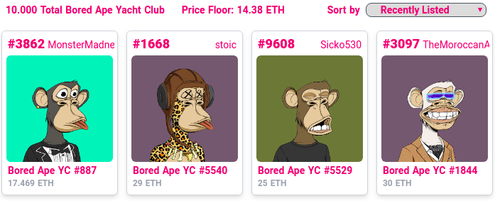 Ein anderes Beispiel ist der Bored Ape Yacht Club (BAYC) - eine Sammlung von 10'000 einzigartigen digitalen Sammlerstücken, die auf der Ethereum-Blockchain leben. Sie wurden von vier Freunden ins Leben gerufen, die ihre Fähigkeiten einsetzen wollten, um etwas neues zu bauen. Dabei haben sie Affen erstellt und haben, von den Vorfahren inspiriert, einen zeitlich begrenzten Verkauf eingeführt. Innerhalb eines Tages waren alle zehntausend Bored Ape Yacht Club Bilder ausverkauft und brachte mehr als zwei Millionen Dollar ein. Seitdem wird die Sammlung für fast hundert Millionen Dollar gehandelt, wobei die billigsten "Apes" oft für fast 40'000 Dollar gekauft werden.