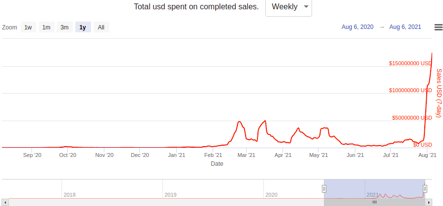 In den letzten Wochen zog der Handel um digitale Bilder in der Form von NFTs massiv an. Dabei werden die NFTs auf verschiedenen Plattformen fast ausschliesslich gegen Ether gehandelt. In den letzten 7 Tagen brachten es die Top 3 Projekte auf einen Umsatz von knapp 80'000 Ether oder umgerechnet auf mehr als 250 Mio. USD.