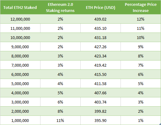 Tabelle 1: Mögliche Preisauswirkungen des Ethereum 2.0 Stakings auf ETH