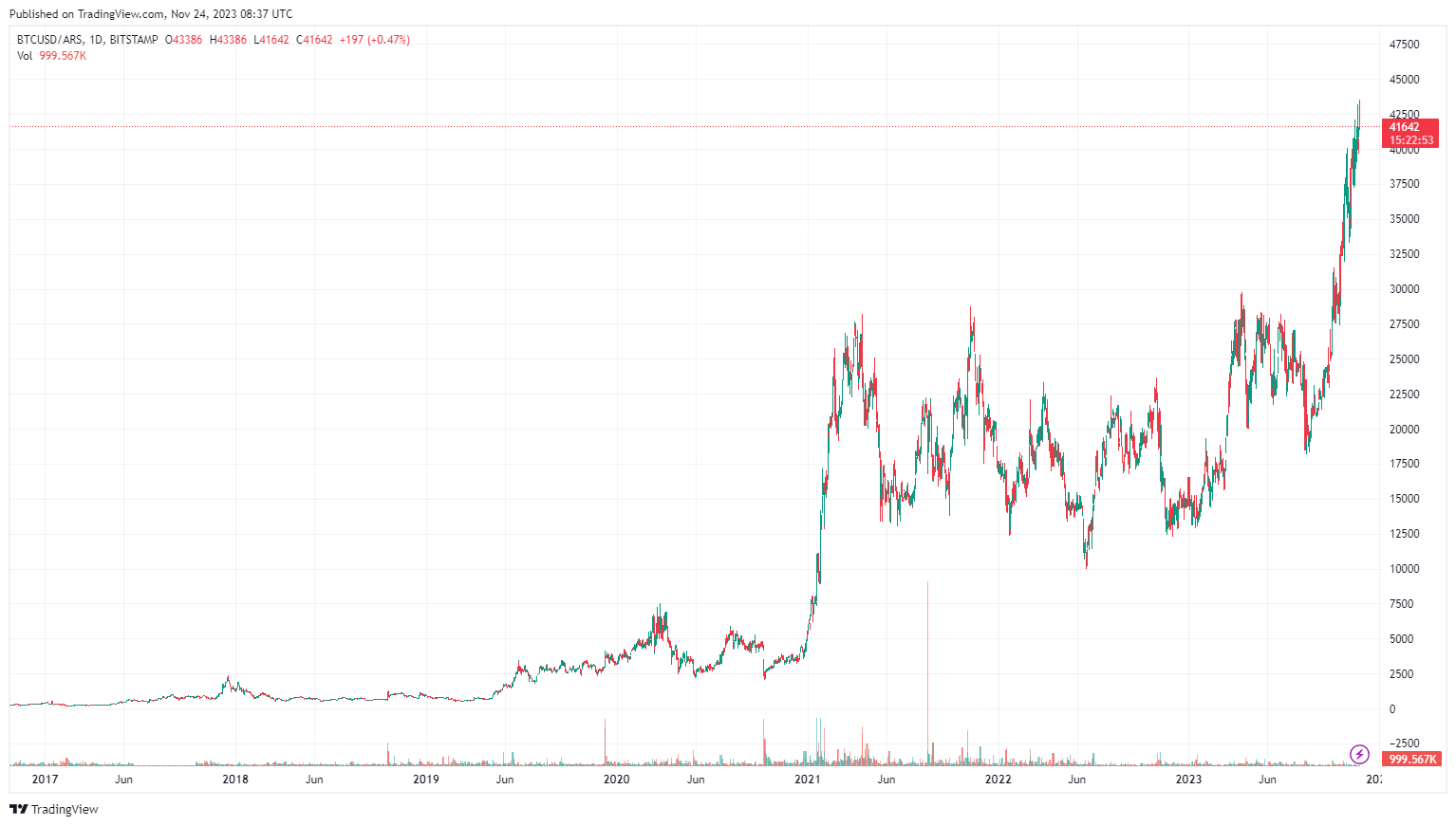 Selbstverständlich birgt die Einführung von Bitcoin Risiken und Chancen. Für Milei besteht die Herausforderung darin, die Bevölkerung und das politische System davon zu überzeugen, eine dezentrale Währung in einem Land mit strengen Währungskontrollen anzunehmen. Für Bukele besteht das Risiko darin, das wirtschaftliche Schicksal eines Landes an ein notorisch unbeständiges digitales Gut zu knüpfen. Doch die potenziellen Vorteile - wirtschaftliche Autonomie für die Argentinier und mehr finanzielle Teilhabe für die Salvadorianer - sind beträchtlich. Immerhin wird die inflationsschützende Eigenschaft Bitcoins durch einen Blick auf den Preisverlauf gegenüber dem Argentinischen Peso offensichtlich.
