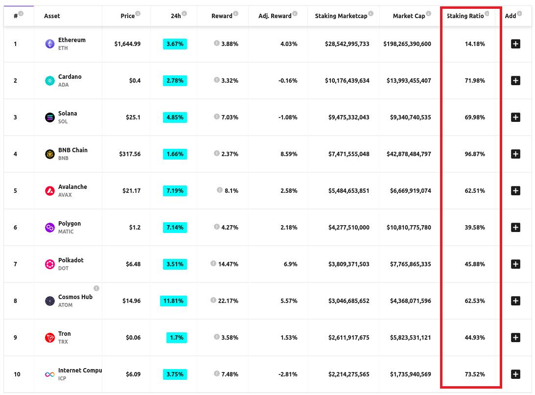 Ethereum weist zurzeit eine schwaches Staking-Verhältnis vor - zumindest im Vergleich mit anderen PoS-Blockchains - und kann sich nur dank dem hohen Einheitspreis in der Top 10 der Staking-Marktkapitalisierung behaupten. Der limitierende Faktor ist auch hier die Illiquidität von Ether-Stakes. Nach dem Shanghai Upgrade dürfte Ethereums Staking-Verhältnis die Parität mit anderen führenden Blockchains erreichen. Schliesslich werden Liquid Staking Derivatives (LSDs) dank EIP-4895 nicht mehr Schuldscheine (IOUs), sondern frei abhebbare ETH darstellen. Ein Restrisiko aufgrund von potenziellen Fehlern in den Smart Contracts bleibt selbstverständlich vorhanden.