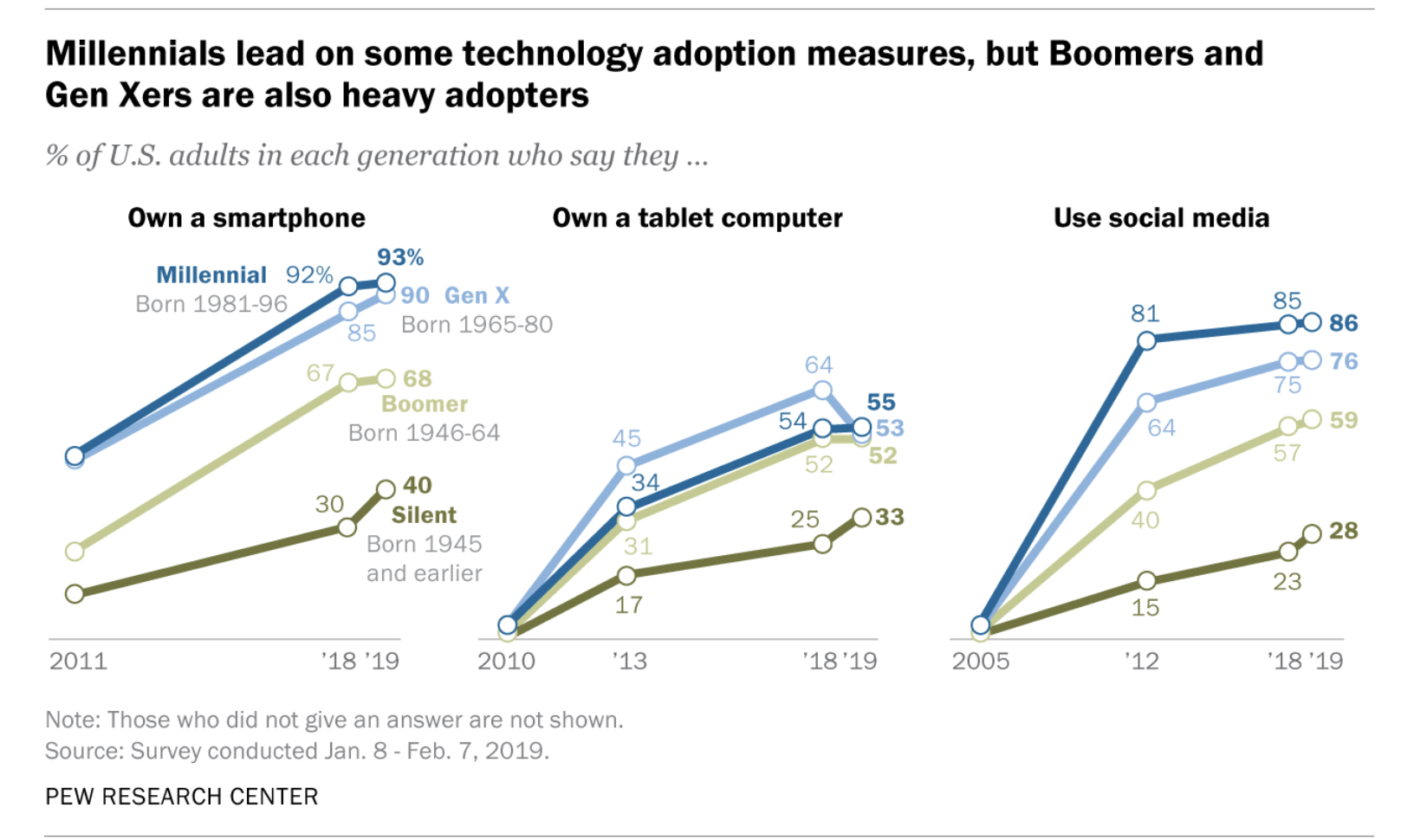 Laut Pew Research scheinen jedoch die Bereitschaft und die Fähigkeit zur technologischen Adoption bei den Millennials die Überlegenheit zu haben. Tatsächlich besitzen 93% der Millennials Smartphones, 86% der Millennials haben angegeben, dass sie soziale Medien nutzen, und fast 100% der befragten Millennials gaben an, das Internet zu nutzen.