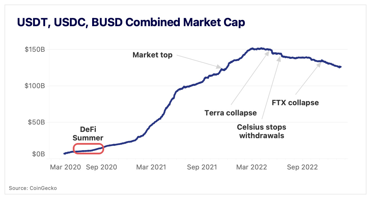 Seitdem ist ihre gemeinsame Marktkapitalisierung jedoch stetig gesunken, wobei es bei wichtigen Marktereignissen zu stärkeren Einbrüchen kam. Interessanterweise erreichten sie jeweils zu unterschiedlichen Zeitpunkten im Jahr 2022 ihren Höchststand: USDT mit 83 Mrd. USD am 30. April (eine Woche vor dem Zusammenbruch von Terra), USDC mit 56 Mrd. USD am 1. Juli (als 3AC und Celsius untergingen) und BUSD mit 23 Mrd. USD am 15. November (als FTX kollabierte).