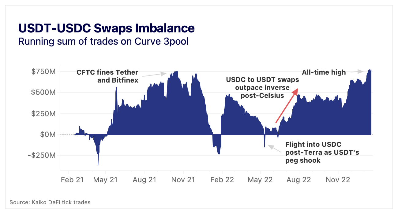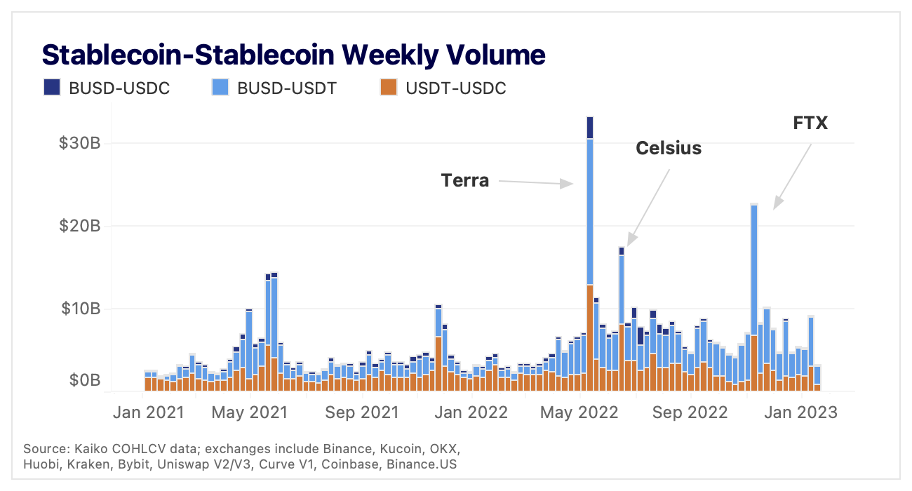 In Anbetracht der relativen Komplexität der Einlösung von USDT ist zu erwarten, dass sich insbesondere Kleinanleger in Stresssituationen für einen Tausch in einen anderen Stablecoin entscheiden (statt für eine Einlösung). Dies hat sich in den Daten weitgehend bestätigt. Die drei Wochen mit dem höchsten Stablecoin/Stablecoin-Volumen waren der Zusammenbruch von Terra, die Einstellung der Abhebungen bei Celsius und der Zusammenbruch von FTX.