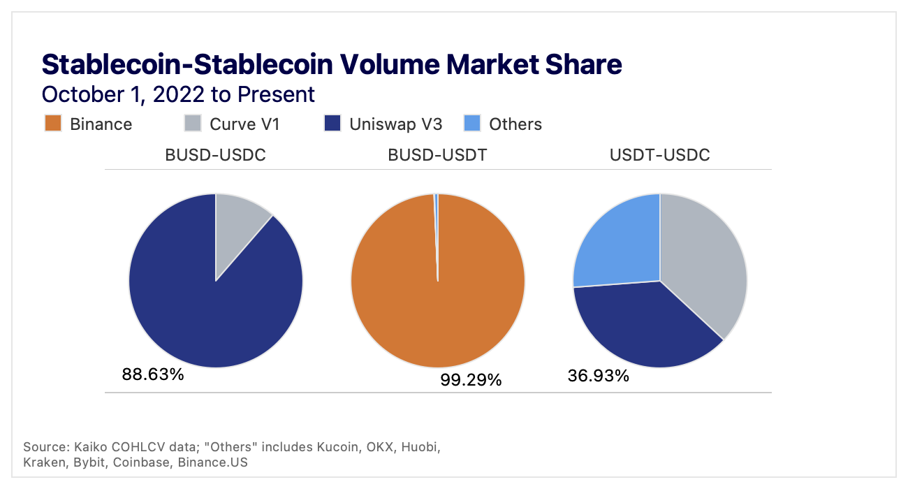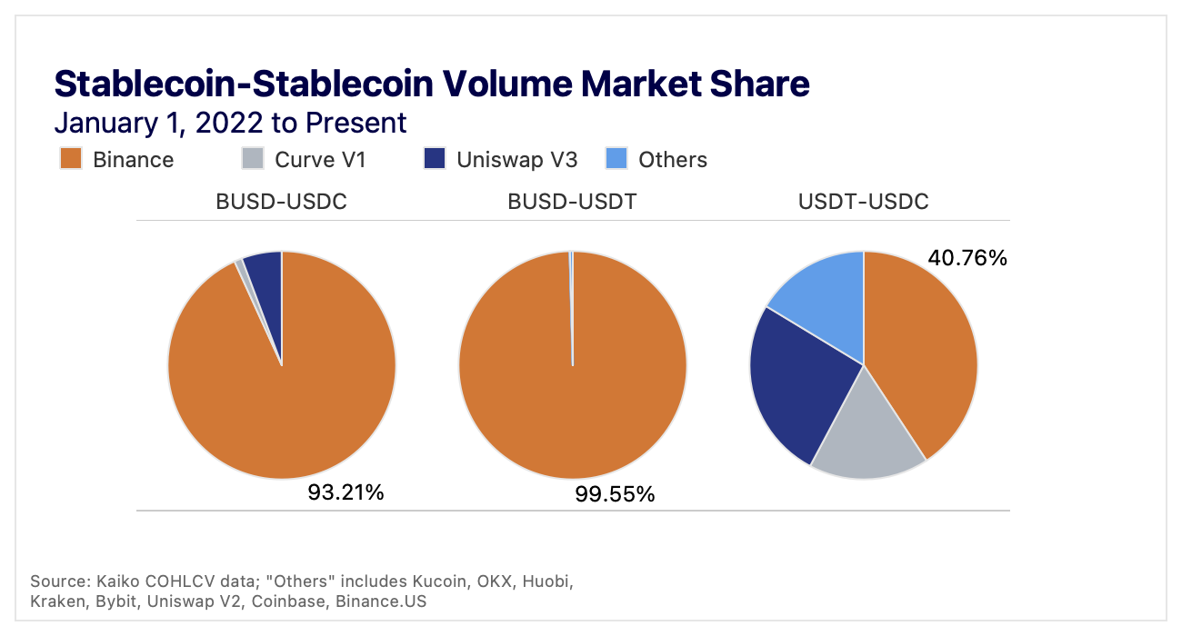 USDT-USDC kann als ein systemisch wichtiges Token-Paar betrachtet werden und zwei DEXs sind eingesprungen, um den Marktanteil von Binance zu übernehmen: Diese beiden DEXs, Curve und Uniswap, ermöglichen jeweils mehr Volumen als sieben der grössten zentralen Börsen (CEXs) zusammen. Der Mangel an CEX-Liquidität für das USDT-USDC-Paar hat den dezentralen Börsen den Weg geebnet, Binance den Marktanteil am Volumen für dieses Paar abzunehmen.