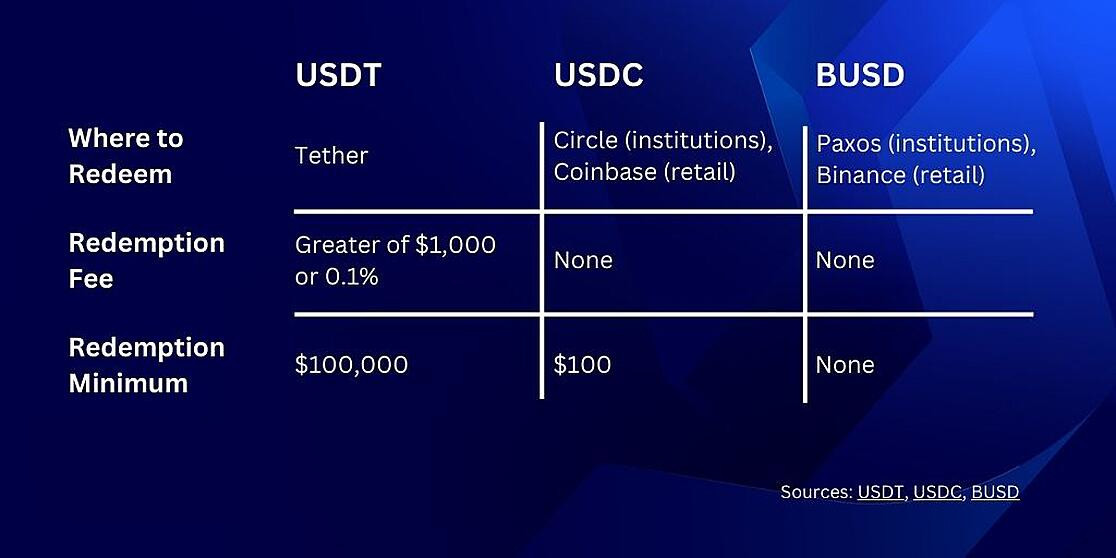 Obwohl die drei Stablecoins im Wesentlichen gleich funktionieren, ist die Einstiegshürde für die Einlösung von USDT grösser als für USDC und BUSD. Dies hat zur Folge, dass das USDT-Angebot im Vergleich zu seinen Konkurrenten knapper ist. Dies bedeutet auch, dass Händler, die nicht über die für die Einlösung erforderlichen 100'000 USD verfügen, häufig auf Spotmärkte zurückgreifen, um ihre USDT loszuwerden.