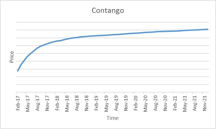 Die sogenannte Futures-Kurve oder Forward-Kurve ist in dieser Situation typischerweise nach oben gerichtet. Im untenstehenden Chart liegt der Kassakurs unter dem Future-Preis, was zu einer aufwärtsgerichteten Kurve führt. Dieser Markt ist in Contango - die Futures werden mit einem Aufschlag gegenüber dem Kassamarkt gehandelt. Das heisst, je weiter sich der Liefertermin in die Zukunft verschiebt, desto höher wird der Preis sein. Das Gegenteil dieser Situation stellt die Backwardation dar.