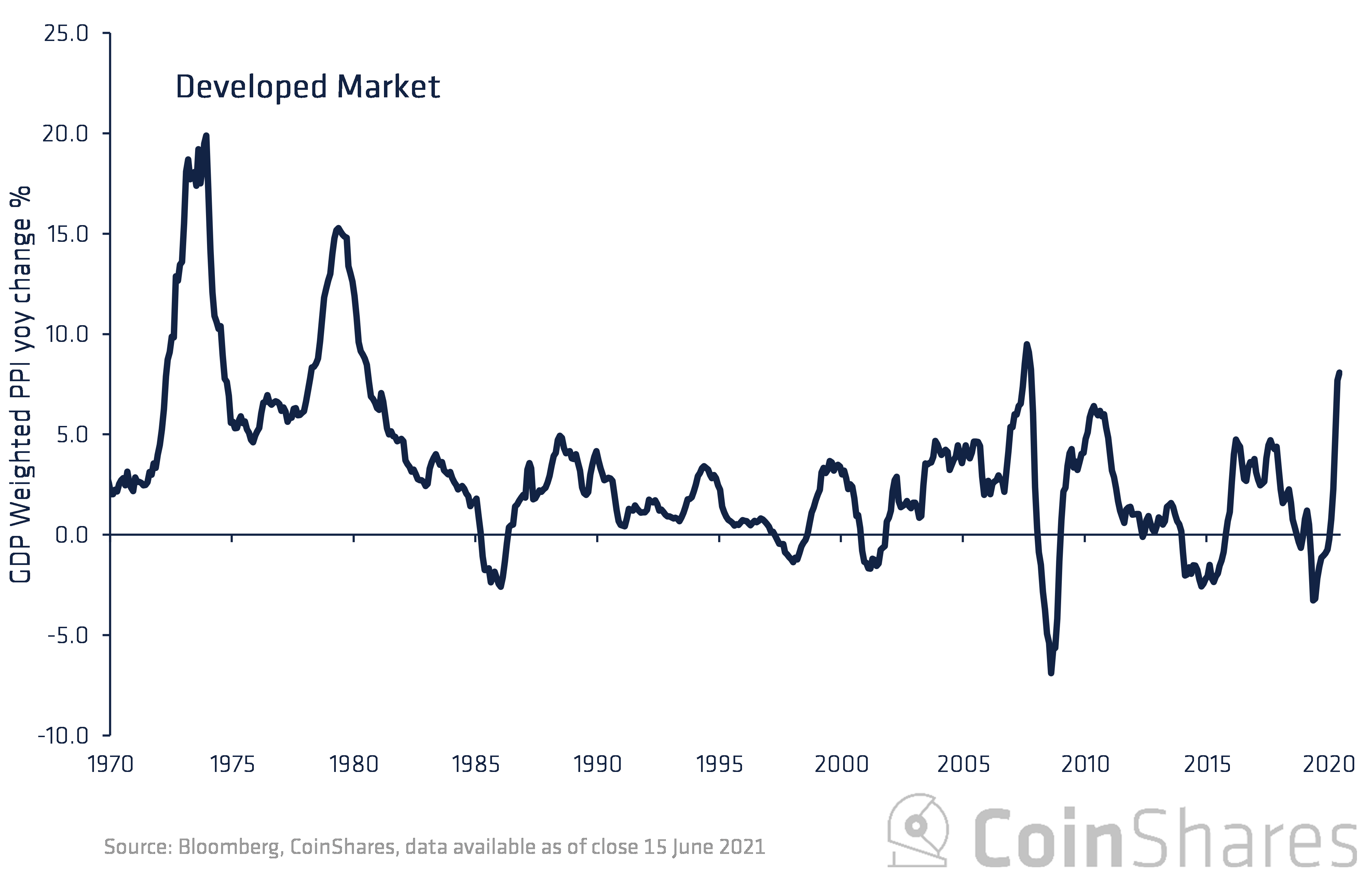 Unabhängig vom Ausgang der Inflation besteht nach wie vor ein beträchtliches Risiko, dass die Zentralbanker die Kontrolle über die Inflation verlieren könnten. Daher werden Inflationsabsicherungen immer beliebter, was durch die oben erwähnten Fondsströme verdeutlicht wird. Es gibt eine kleine Auswahl an harten Vermögenswerten, die während eines Inflationsschubes überdurchschnittlich gut abschneiden sollten, und wir glauben, dass Bitcoin einer davon ist.