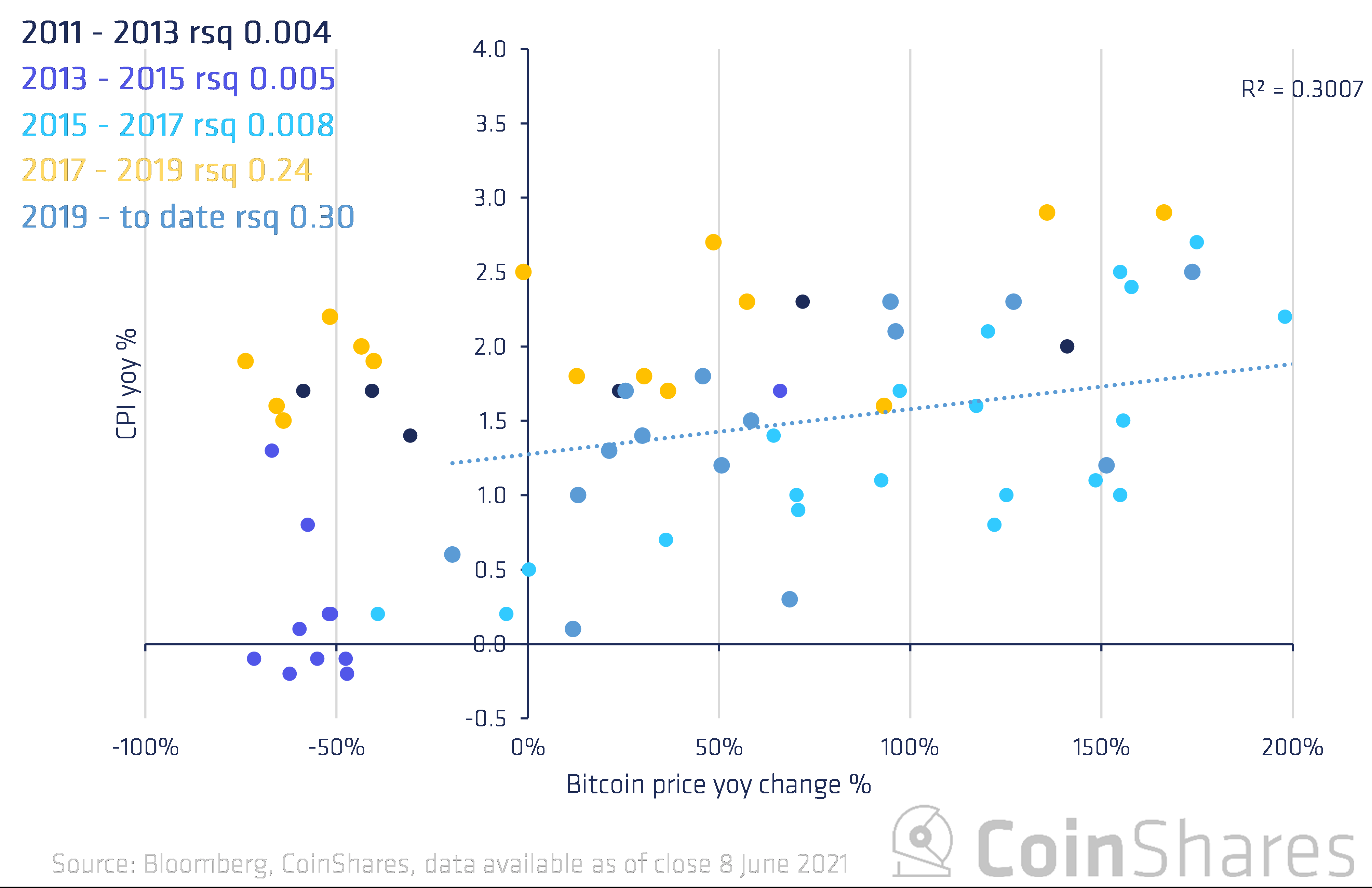 Die Daten deuten darauf hin, dass Bitcoin beginnt, diese Rolle der Inflationsabsicherung zu erfüllen. Die Beobachtung der Preisänderungen im Verhältnis zu den Änderungen der Inflation über Zweijahreszeiträume seit seiner Entstehung im Jahr 2009 zeigt, dass sich die Korrelation erhöht, mit einem aktuellen R2 von 0.30 (seit 2019). Übrigens ist die Korrelation zwischen Bitcoin und Inflation derzeit besser als die zwischen Inflation und Gold.