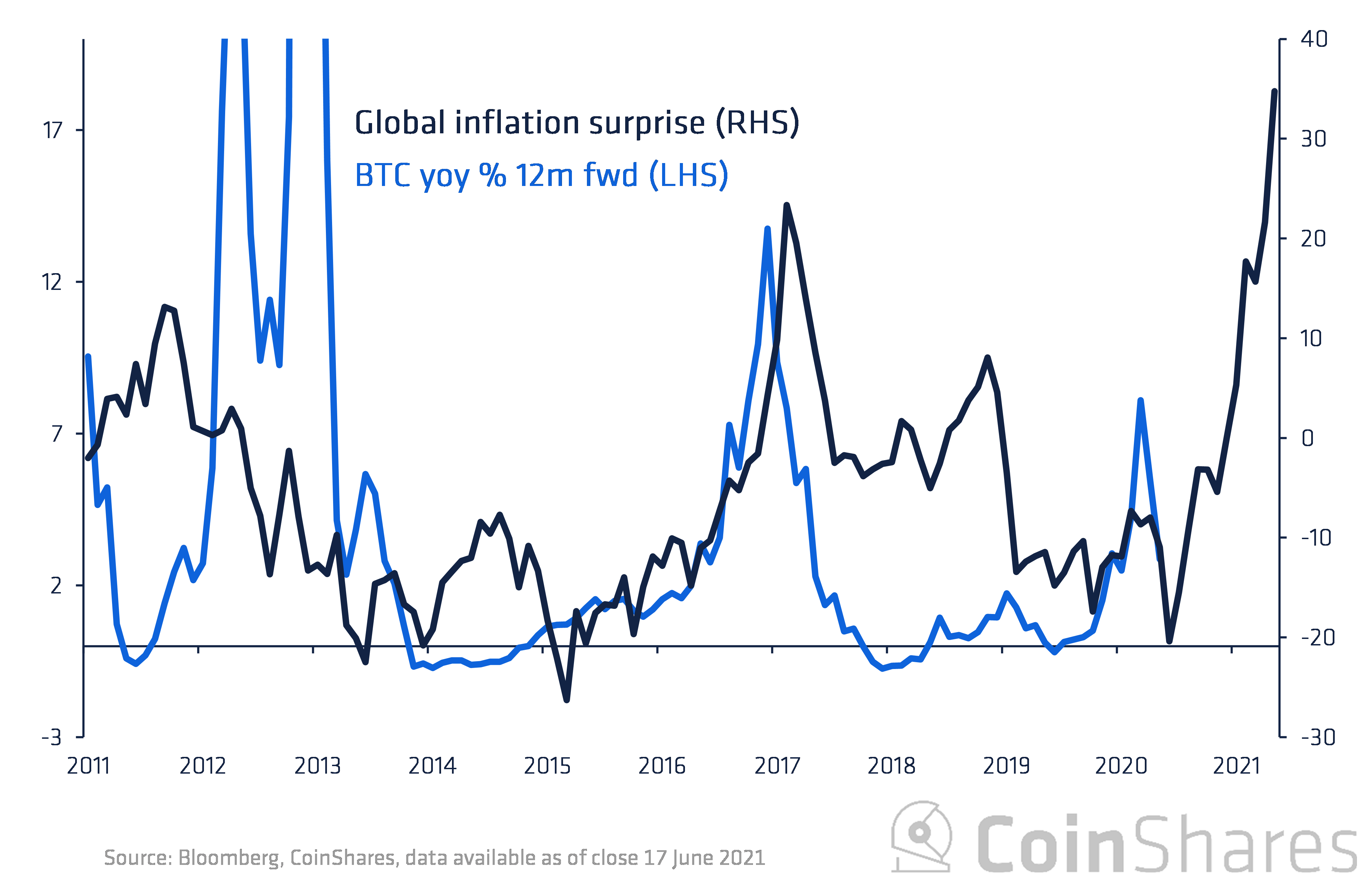 Citi erstellt einen Index, der die unerwartete oder "überraschende" Inflation abbildet, indem sie die Inflationsprognosen mit den tatsächlichen Ergebnissen vergleichen. Bei Werten über Null ist die Inflation höher als erwartet. Bitcoin hat auch eine frühe, aber potenziell zwingende Beziehung mit unerwarteter Inflation. Unsere Analyse zeigt, dass Bitcoin auf unerwartete Inflation zu reagieren scheint und ansteigt, wenn die gelieferten Inflationszahlen höher als die Erwartungen sind.