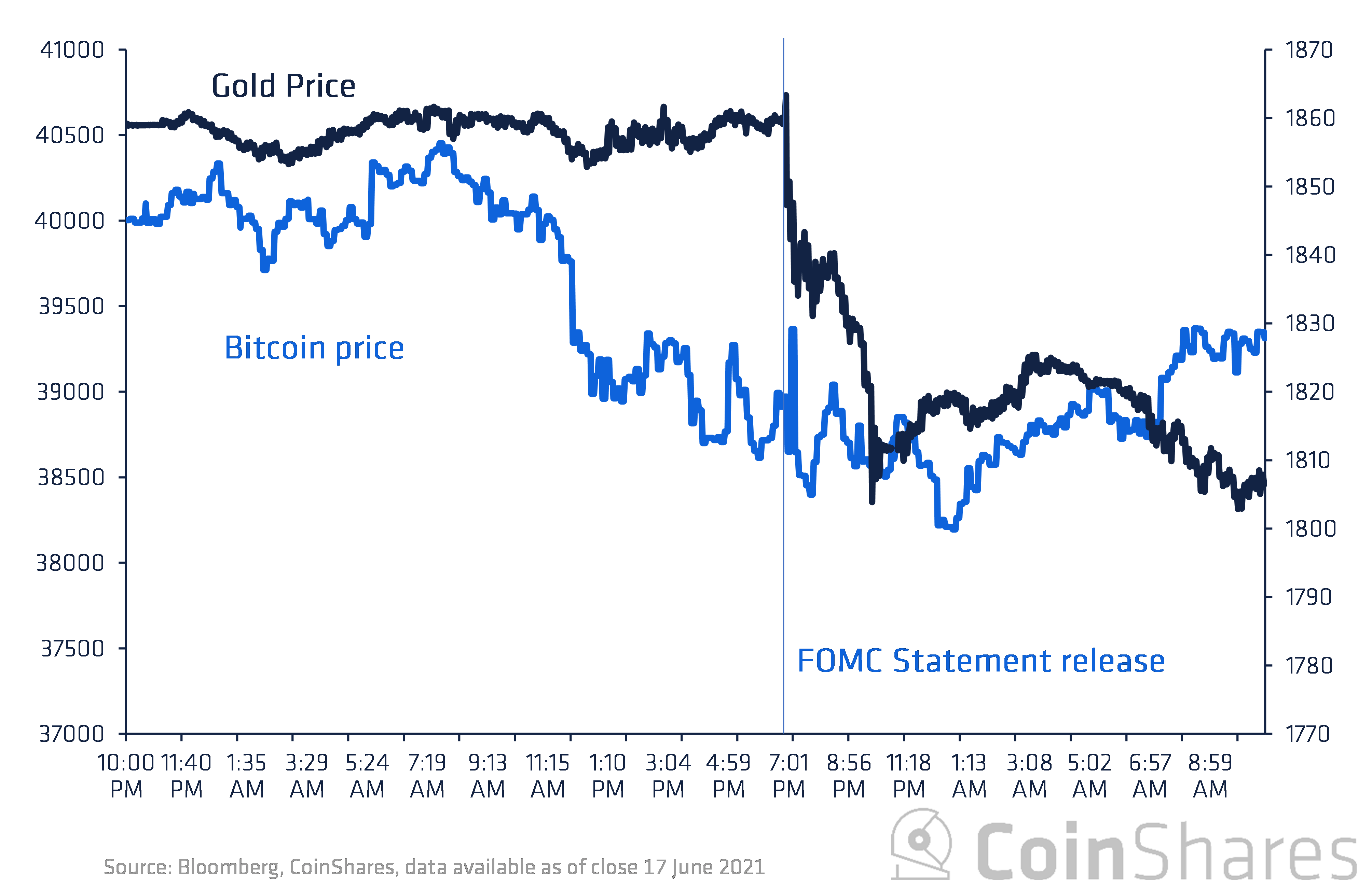 Es gibt immer mehr Anzeichen dafür, dass Bitcoin als Vermögenswert reift. Nach dem jüngsten FOMC-Statement (16. Juni), bewegten sich die Preise in einer sehr ähnlichen Weise wie Gold. Dies unterstreicht, dass sich Bitcoin so verhält, wie Anleger es von einem Sachwert erwarten würden - er wertet auf, wenn der US-Dollar sinkt und umgekehrt.
