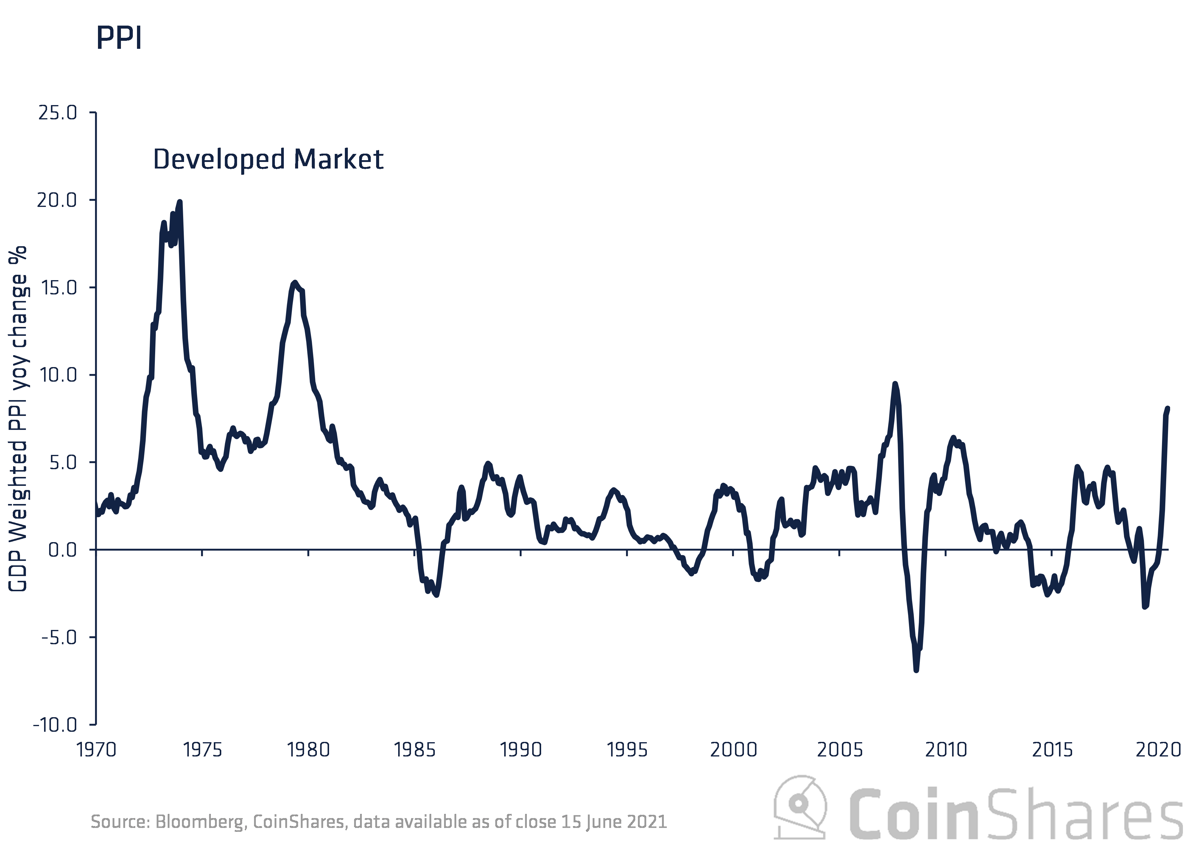Unabhängig vom Ausgang der Inflation besteht nach wie vor ein beträchtliches Risiko, dass die Zentralbanker die Kontrolle über die Inflation verlieren könnten. Daher werden Inflationsabsicherungen immer beliebter, was durch die oben erwähnten Fondsströme verdeutlicht wird. Es gibt eine kleine Auswahl an harten Vermögenswerten, die während eines Inflationsschubes überdurchschnittlich gut abschneiden sollten, und wir glauben, dass Bitcoin einer davon ist.