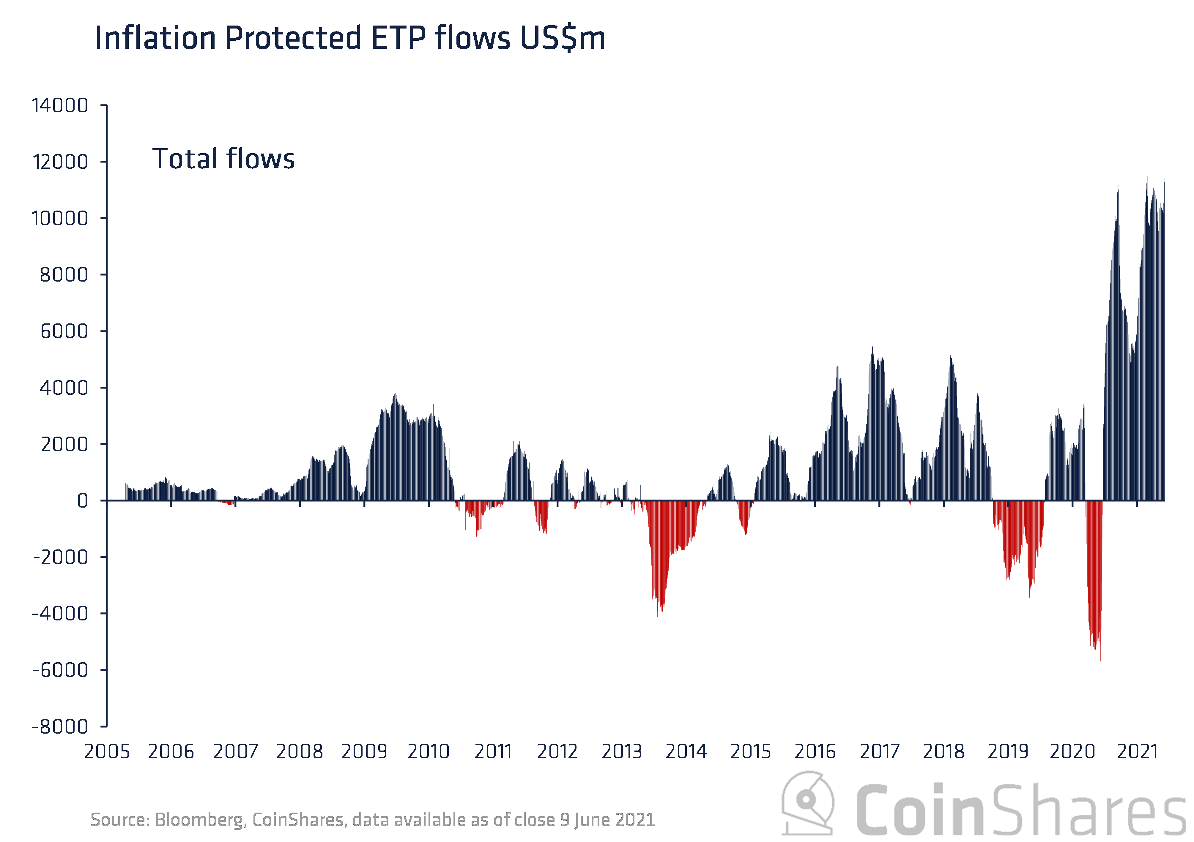 Auch das Anlegerverhalten deutet darauf hin, dass viele von dem ergebnisorientierten Ansatz nicht überzeugt sind. Das verwaltete Vermögen in inflationsgeschützten börsengehandelten Produkten ist im letzten Jahr um 74% gestiegen, ausgelöst durch eine Flut von Zuflüssen seit Mitte 2020.