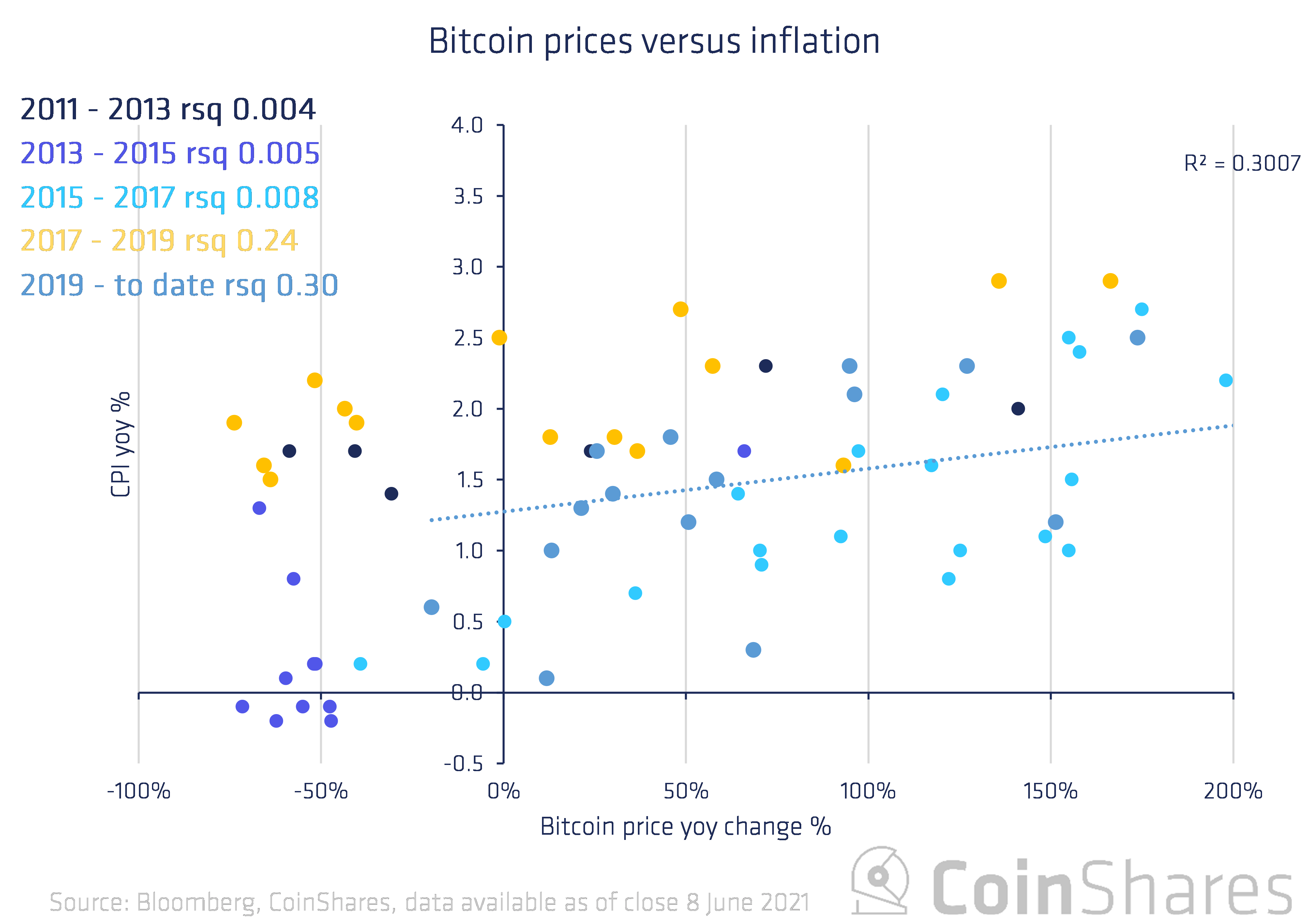 Die Daten deuten darauf hin, dass Bitcoin beginnt, diese Rolle der Inflationsabsicherung zu erfüllen. Die Beobachtung der Preisänderungen im Verhältnis zu den Änderungen der Inflation über Zweijahreszeiträume seit seiner Entstehung im Jahr 2009 zeigt, dass sich die Korrelation erhöht, mit einem aktuellen R2 von 0.30 (seit 2019). Übrigens ist die Korrelation zwischen Bitcoin und Inflation derzeit besser als die zwischen Inflation und Gold.