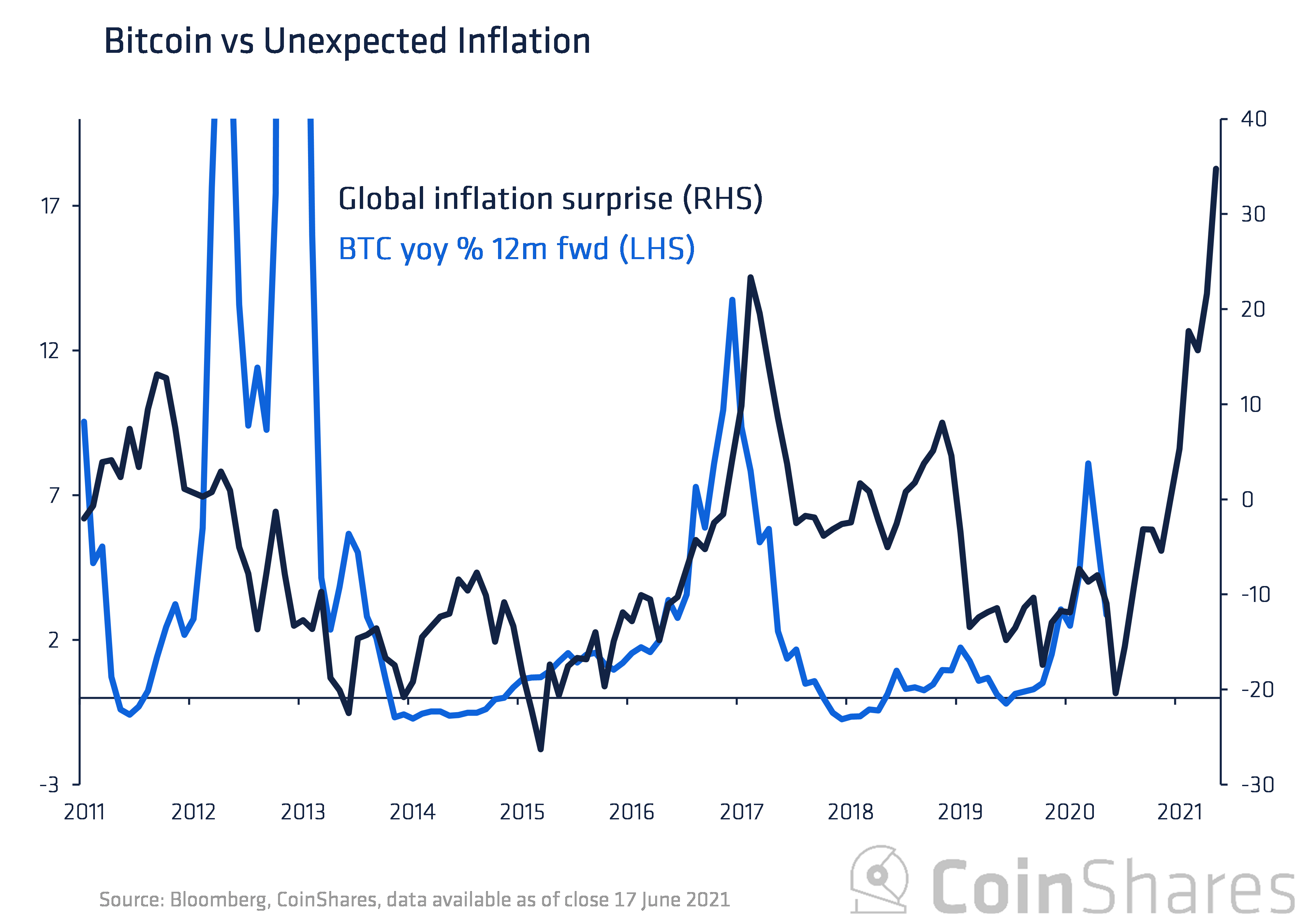 Citi erstellt einen Index, der die unerwartete oder "überraschende" Inflation abbildet, indem sie die Inflationsprognosen mit den tatsächlichen Ergebnissen vergleichen. Bei Werten über Null ist die Inflation höher als erwartet. Bitcoin hat auch eine frühe, aber potenziell zwingende Beziehung mit unerwarteter Inflation. Unsere Analyse zeigt, dass Bitcoin auf unerwartete Inflation zu reagieren scheint und ansteigt, wenn die gelieferten Inflationszahlen höher als die Erwartungen sind.