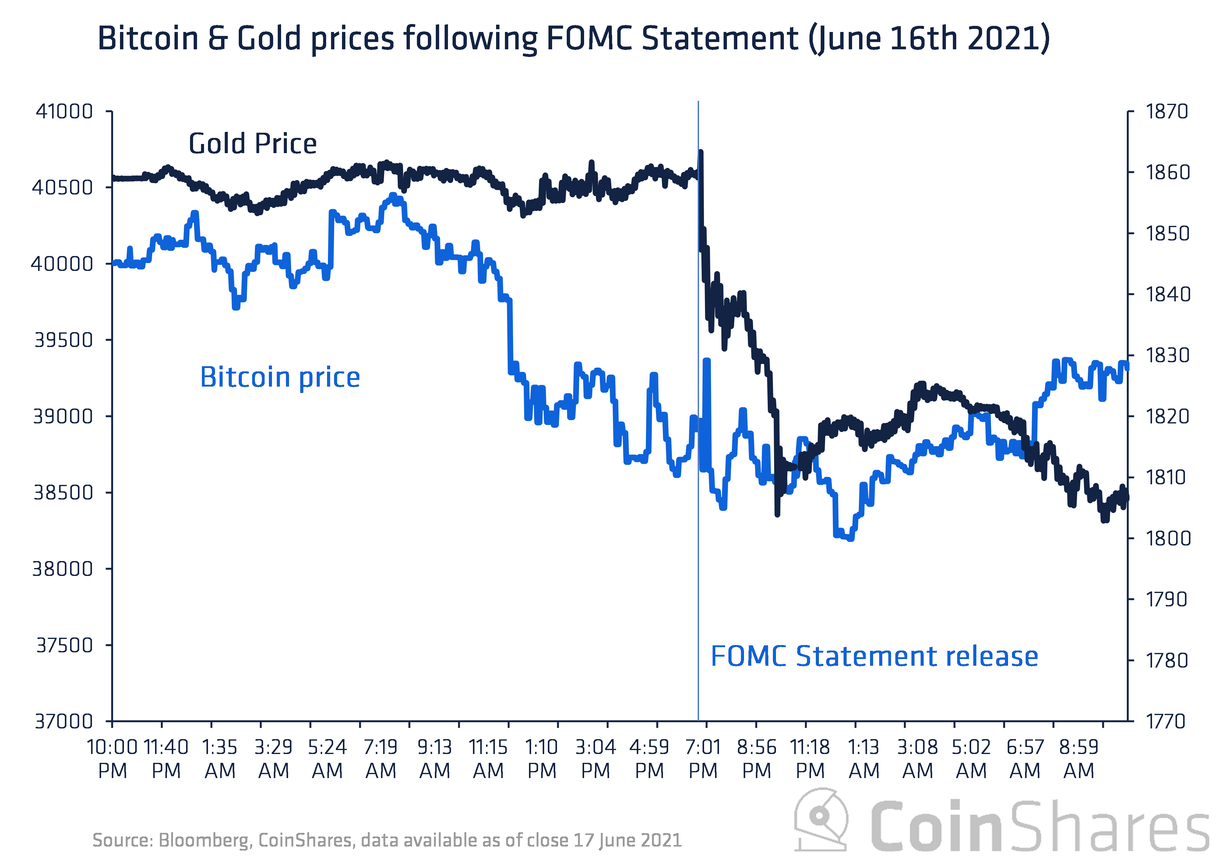 Es gibt immer mehr Anzeichen dafür, dass Bitcoin als Vermögenswert reift. Nach dem jüngsten FOMC-Statement (16. Juni), bewegten sich die Preise in einer sehr ähnlichen Weise wie Gold. Dies unterstreicht, dass sich Bitcoin so verhält, wie Anleger es von einem Sachwert erwarten würden - er wertet auf, wenn der US-Dollar sinkt und umgekehrt.