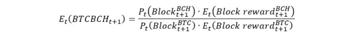 Gemäß der Mining-Paritäts-Bedingung sollte der Wechselkurs für BTCBCH gleich dem Verhältnis der Wahrscheinlichkeit, den nächsten Block jedes Coins zu minen, multipliziert mit den jeweiligen Belohnungen sein.