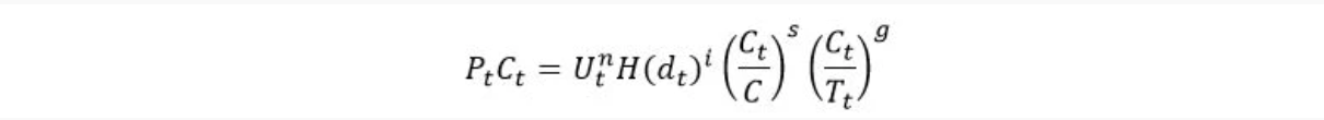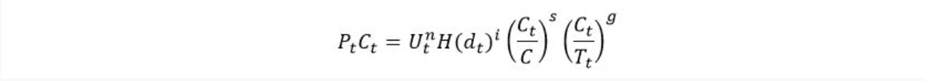 Der zweite Ausdruck ist der Wert der Unveränderlichkeit. H(d,t) ist die kalibrierte Netzwerk-Hash-Rate und i der Unveränderlichkeitsparameter; der zweite Ausdruck misst die Netzwerksicherheit. Je höher i, desto wichtiger ist die Unveränderlichkeit als Merkmal und desto höher der damit verbundene Wert. H ist die kalibrierte Netzwerk-Hash-Rate-Variable, definiert als d.2^32, wobei d die Schwierigkeit ist [1]. Da 1/H(d,t) die Wahrscheinlichkeit ist, dass der nächste Hash einen Block abbaut, ist die Sicherheit der Blockchain umso höher, je grösser H(d,t) ist. Schliesslich misst der Unveränderlichkeitsparameter i die Preiselastizität der Sicherheit.