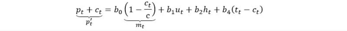 Um unser Modell zu berechnen, führen wir eine OLS-Regression der logarithmischen Transformation unseres Modells [4] durch. (Beachten Sie, dass aus Gründen der Lesbarkeit Variablen, die zuvor in Großbuchstaben geschrieben wurden, in Kleinbuchstaben notiert werden, wenn sie in Logarithmen ausgedrückt werden. Interessierte Leser sind eingeladen, den Anhang zu lesen, um zu sehen, wie wir zu dem ökonometrischen Modell gelangt sind). Nach der Umordnung wird das ökonometrische Modell