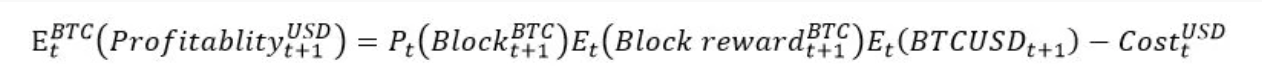 Die erwartete USD-Rentabilität beim Mining des nächsten BTC-Blocks wird wie folgt ausgedrückt: