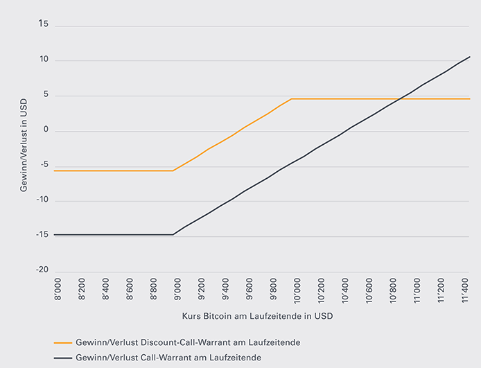 Prinzipiell erreicht der Discount-Warrant deutlich schneller die Gewinnzone, als der klassische Warrant. Nimmt man den neu emittierten Discount-Call Warrant auf Bitcoin, welcher einen unteren Ausübungspreis von 9'000 USD, respektive einen oberen Ausübungspreis von 10'000 USD aufweist als Fallbeispiel und nimmt einen Einstandskurs von USD 5.50 an, erreicht der Discount-Call die Gewinnzone bereits bei einem Bitcoin-Kurs von USD 9'550 am Laufzeitende. Wie in der vorgehenden Grafik illustriert, erlangt ein klassischer Call dagegen die Gewinnzone unter der Annahme eines Einstandskurses von USD 14.50 erst bei USD 10’450. Jedoch erreicht der Discount-Call bei einem Bitcoin-Kurs von USD 10'000 seine Maximalauszahlung von USD 10, wohingegen der Wert des Calls weiter linear ansteigt. Aufgrund des günstigeren Kaufpreises des Discount-Calls muss der Bitcoin am Laufzeitende allerdings mindestens bei USD 10’900 notieren, um den gleichen Gewinn abzuwerfen, wie beim Discount-Call-Warrant. Erst bei einem Anstieg des Basiswerts darüber hinaus ist eine Investition in den Vanilla-Call ertragreicher.