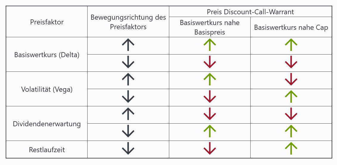 Aber nicht nur am Laufzeitende errechnet sich so der Wert des Discount-Call Warrants. Auch während der Laufzeit wird der Wert errechnet, in dem man den Wert beider Positionen errechnet. Jedoch besteht der Wert der beiden Komponenten während der Laufzeit nicht ausschliesslich aus dem inneren Wert der Optionen, also dem Betrag, den der Basiswert über dem Ausübungspreis der jeweiligen Option notiert, sondern auch aus dem Zeitwert. Dieser ergibt sich (insbesondere) aus der erwarteten Schwankungsbreite («implizite Volatilität»), der Restlaufzeit und den Dividendenerwartungen. Die Werte der einzelnen Preisfaktoren der Optionspositionen werden zwischen der Long-Position und der Short-Position verrechnet, sodass sich dadurch der Discount-Warrant wesentlich robuster gegenüber Veränderungen dieser Preisfaktoren zeigt, als es ein klassischer Warrant ist. Dies ist vor allem dann relevant, wenn der Discount-Warrant nicht bis zum Laufzeitende gehalten wird, sondern zu einem beliebigen Zeitpunkt während der Laufzeit im Sekundärmarkt wieder an die Emittentin verkauft wird.