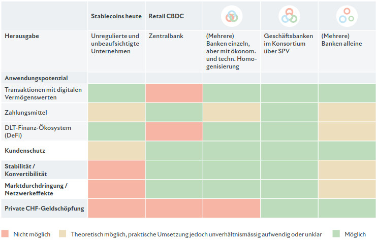 Laut der Bankiervereinigung unterstreicht die sich ständig verändernde Landschaft der Kryptowährungen den Bedarf an einer stabilen und sicheren digitalen Währung. Private Stablecoins seien in letzter Zeit oft volatil. Ausserdem fehle ihnen eine für eine breite Akzeptanz notwendige Schlüsselkomponente: die offizielle, regulatorische Unterstützung, die nur traditionelles Geld besitzt. Da der digitale Token an den Schweizer Franken gebunden ist, wären die Kursschwankungen minimal und es gäbe kein Risiko, dass der Wert sich stark bewegt.