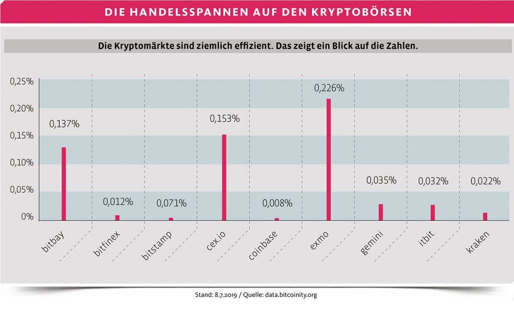 Der Kryptomarkt habe sich in den vergangenen zwei Jahren stark professionalisiert und darum insgesamt effizienter geworden, so Tradingexperte Flury. Dass Arbitrage in der Kryptowelt hocheffizient sein muss, leuchtet ein: Abgesehen von häufig unterschätzten Lagerkosten sind Kryptoassets wie Bitcoin und Ether digital, rund um die Uhr, sieben Tage die Woche handelbar, fungibel, das heisst innerhalb derselben Gattung austauschbar. Genau diese Voraussetzungen machen sie zu einem effizienten Tradingvehikel.