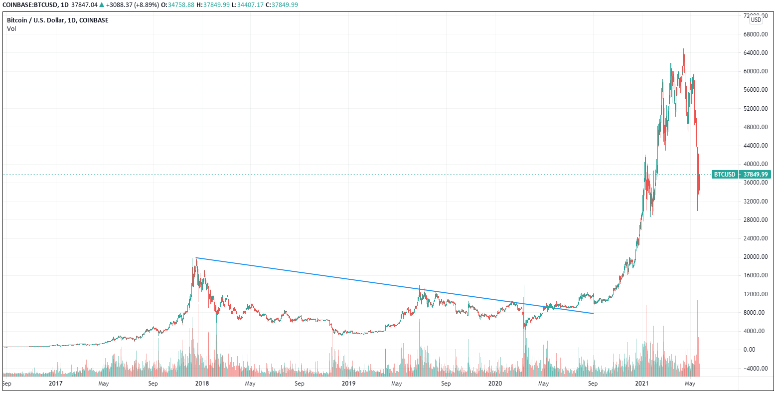 Bitcoin zählt seit seinem Bestehen zu den Assets mit der besten Performance. Dieses Potenzial kommt nicht ohne Preis. Assets, die ein exponentielles Wachstum verkörpern, setzen ihren Preisanstieg nicht graduell fort. Manchmal lohnt es sich, den Preisverlauf von Bitcoin und anderen Kryptowährungen aus einer entfernteren Objektive zu betrachten. Trotz des Kurssturzes der letzten Tage weist Bitcoin noch immer eine Wertsteigerung von gut 220% gegenüber dem Beginn des aktuellen Bullenlaufs Ende Oktober 2020 auf. Über die letzten fünf Jahre legte die digitale Währung beeindruckende 8600% hin, was einer durchschnittlichen jährlichen Rendite von über 1700% entspricht. Dies, obwohl die Kryptowährung seit dem Winter 2017/2018 eine dreijährige Phase mit sinkenden Kursen, einen sogenannten Bärenmarkt, durchlebte.