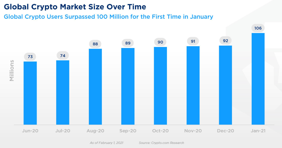 Die geschätzten Benutzerzahlen von Kryptowährungen haben dieses Jahr die 100 Mio. Grenze überschritten und verfügen über jährliche Wachstumsraten von über 100%. Hochgerechnet werden demzufolge bereits in etwas mehr als drei Jahren über 1 Mrd. Menschen Kryptowährungen nutzen. Digitale Zentralbankwährungen (CBDCs) und die Einführung von privaten Stablecoins wie Diem werden die globale Adoption von digitalen Währungen zusätzlich vorantreiben.