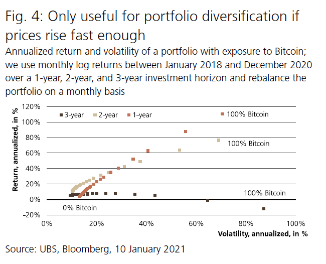 Für eine Integration in ein Portfolio sieht die UBS in ihrem Bericht keine offensichtlichen Argumente. Teilweise wird auf die weitergehende Studie mit dem Namen the Rise of Bitcoin verwiesen. Darin wird der grössten Kryptowährung zwar ein gewisser Diversifikationseffekt zugesprochen, allerdings seien die risikoadjustierten Erträge hauptsächlich in Phasen mit hohen Preisanstiegen attraktiv. Als Grundlage der Datenerhebung hat die UBS die Periode Januar 2018 - Dezember 2020 gewählt.