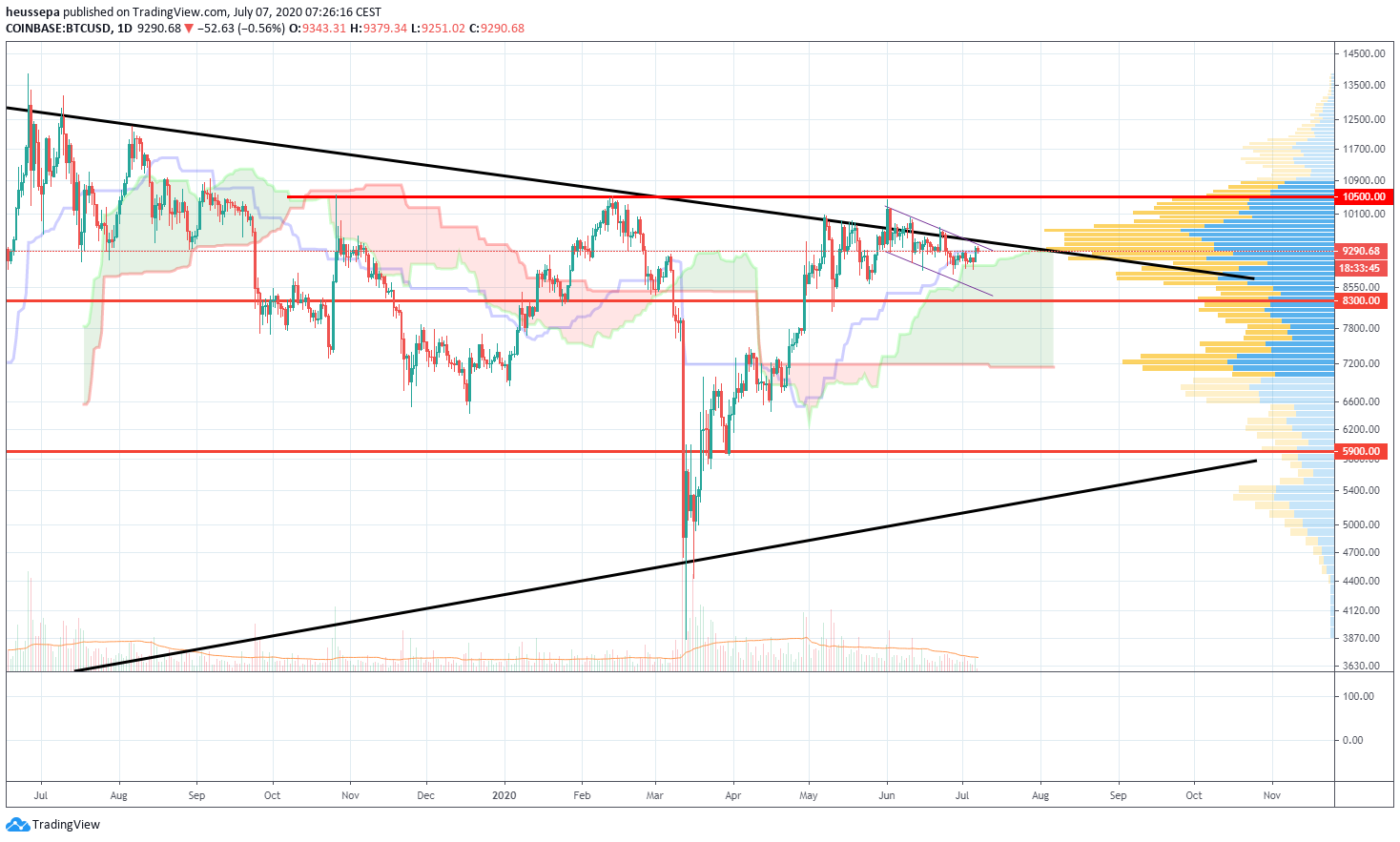 Auf dem Tages-Chart kommen eine ganze Reihe wichtiger Punkte zusammen. So haben wir z.B. einen Abwärts-Kanal, dessen Oberseite sehr nahe am aktuellen Kurs liegt. Dann sehen wir die grosse Trendlinie des potenziellen symmetrischen Dreiecks und das obere Band der Ichimoku-Wolke, die sich mit dem Preis direkt auf der Grundlinie schließt.