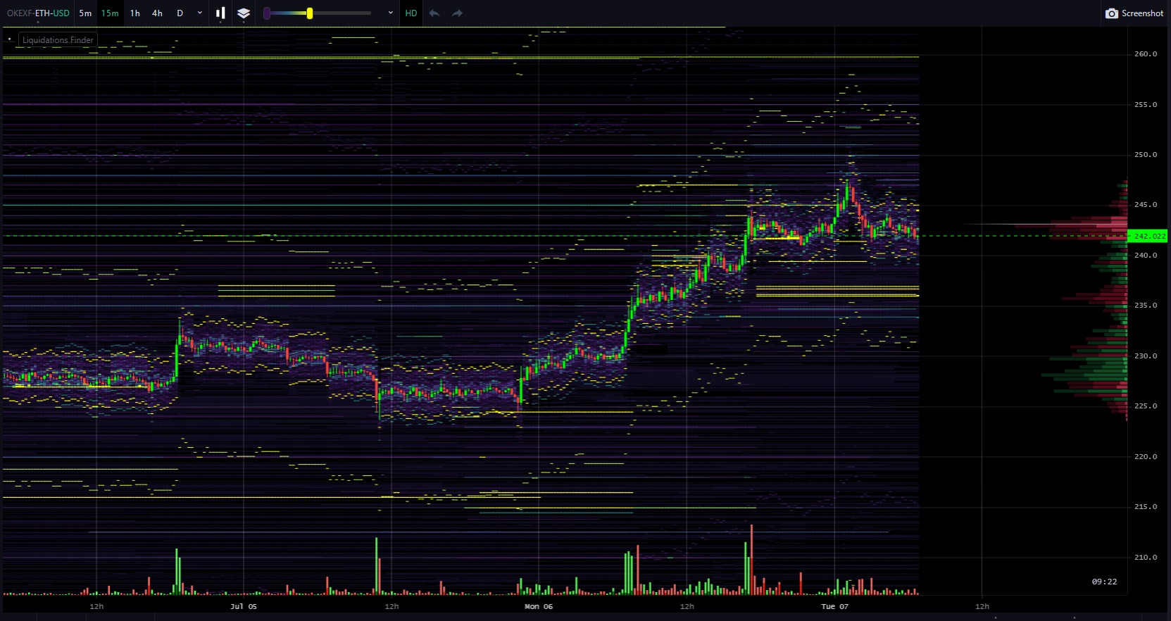 Auf dem 4-Stunden-Chart müssen wir sehen, dass die Ichimoku-Wolke bullisch wird (grün). Es wäre schön, nicht unter $235 zu handeln und die obere Trendlinie des potentiellen Dreiecks herauszunehmen. Wenn uns das gelingt, ist hinsichtlich der Preisliquidität nicht viel im Weg, aber wir werden uns das mit den Heatmaps unten genauer ansehen.
