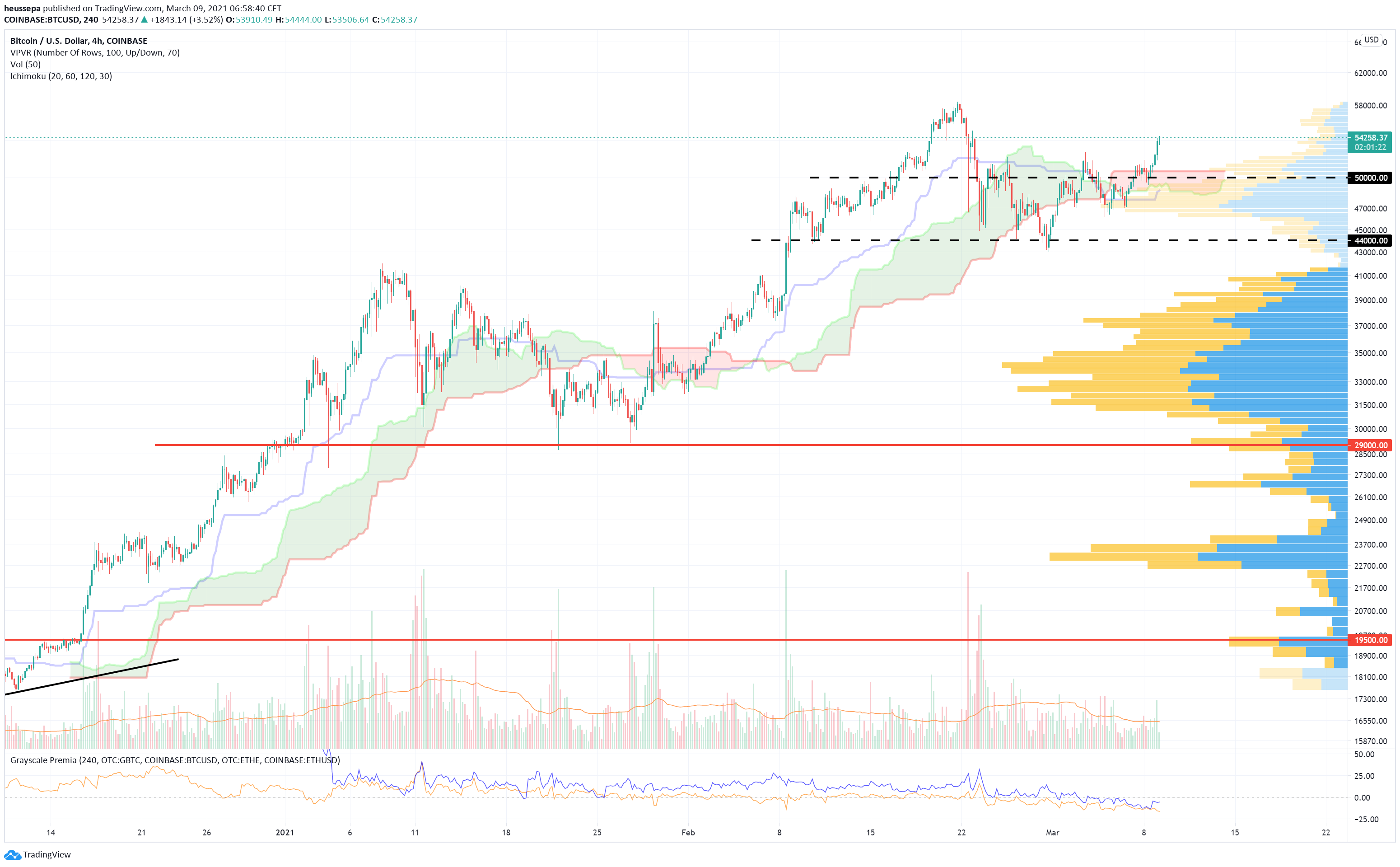Im Chart sehe ich einige positive Anzeichen für eine weitere Aufwärtsdynamik. Erstens haben wir die bärische Ichimoku-Wolke durchbrochen und ein neues lokales Hoch (aus der Konsolidierungsphase) erreicht. Während der Konsolidierung haben wir einen soliden Liquiditätspool bei etwa 47k aufgebaut, der meiner Meinung nach der lokale Boden sein sollte, bis wir ein neues ATH erreichen.