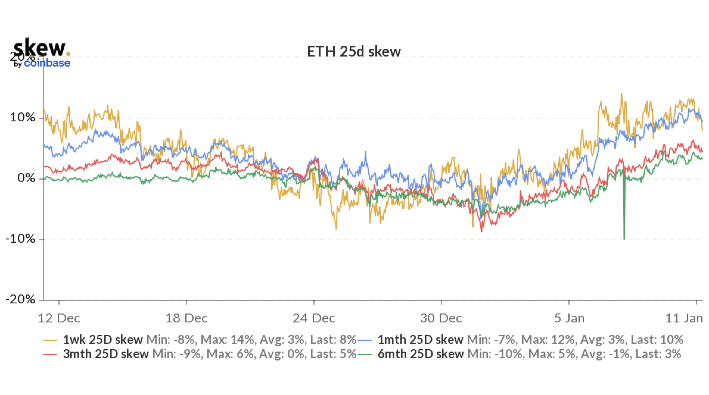 Beginnen wir mit Ether. Der Skew ist bei Laufzeiten bis zu 180 Tagen positiv. Der wöchentliche Skew ist am positivsten (derzeit bei 11%), aber der 25-Tage-Skew ist fast genauso hoch (derzeit bei 10%). Dies bedeutet, dass die Risk Reversal Strategie mit einmonatigen Optionen bis zum Verfall durchgeführt werden könnte.