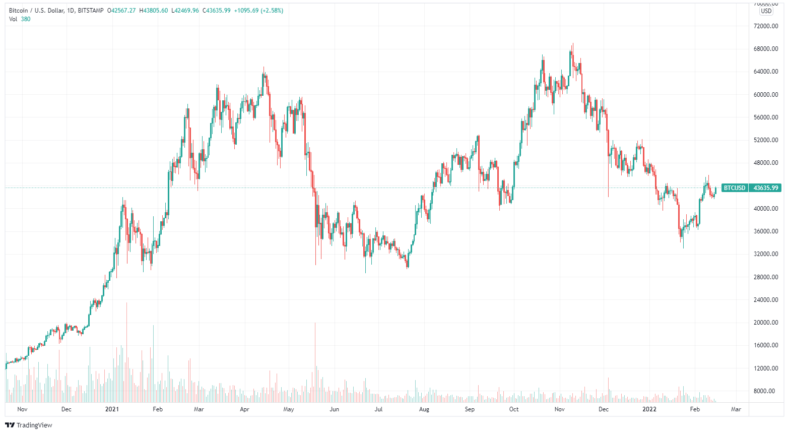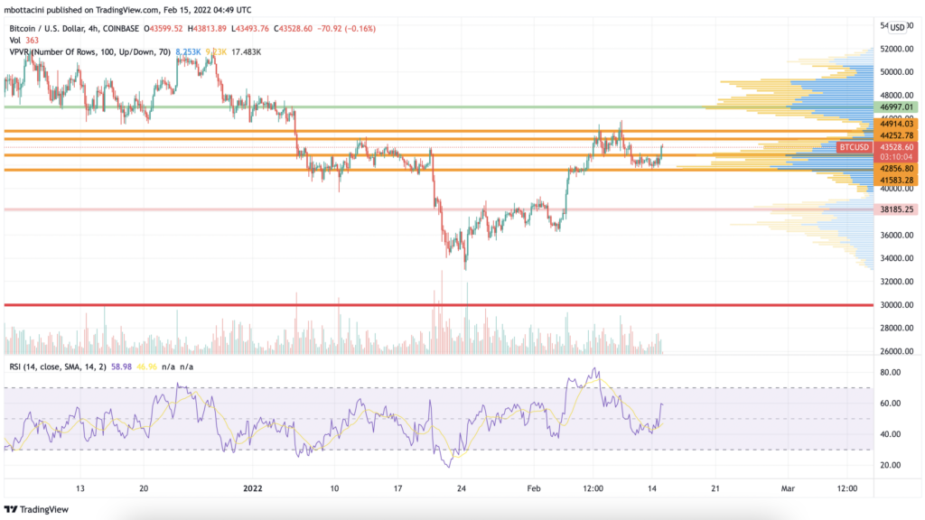 Die implizite Volatilität hat sich etwas nach oben bewegt (66,86%), und die Terminstruktur bleibt fast identisch WoW. Wie die Grafik zeigt, hat sich BTC seit Anfang 2022 nicht wirklich bewegt. Die wichtigsten Widerstandsniveaus liegen immer noch zwischen 45k-47k, und die wichtigsten Unterstützungsniveaus liegen bei 42k-38k.