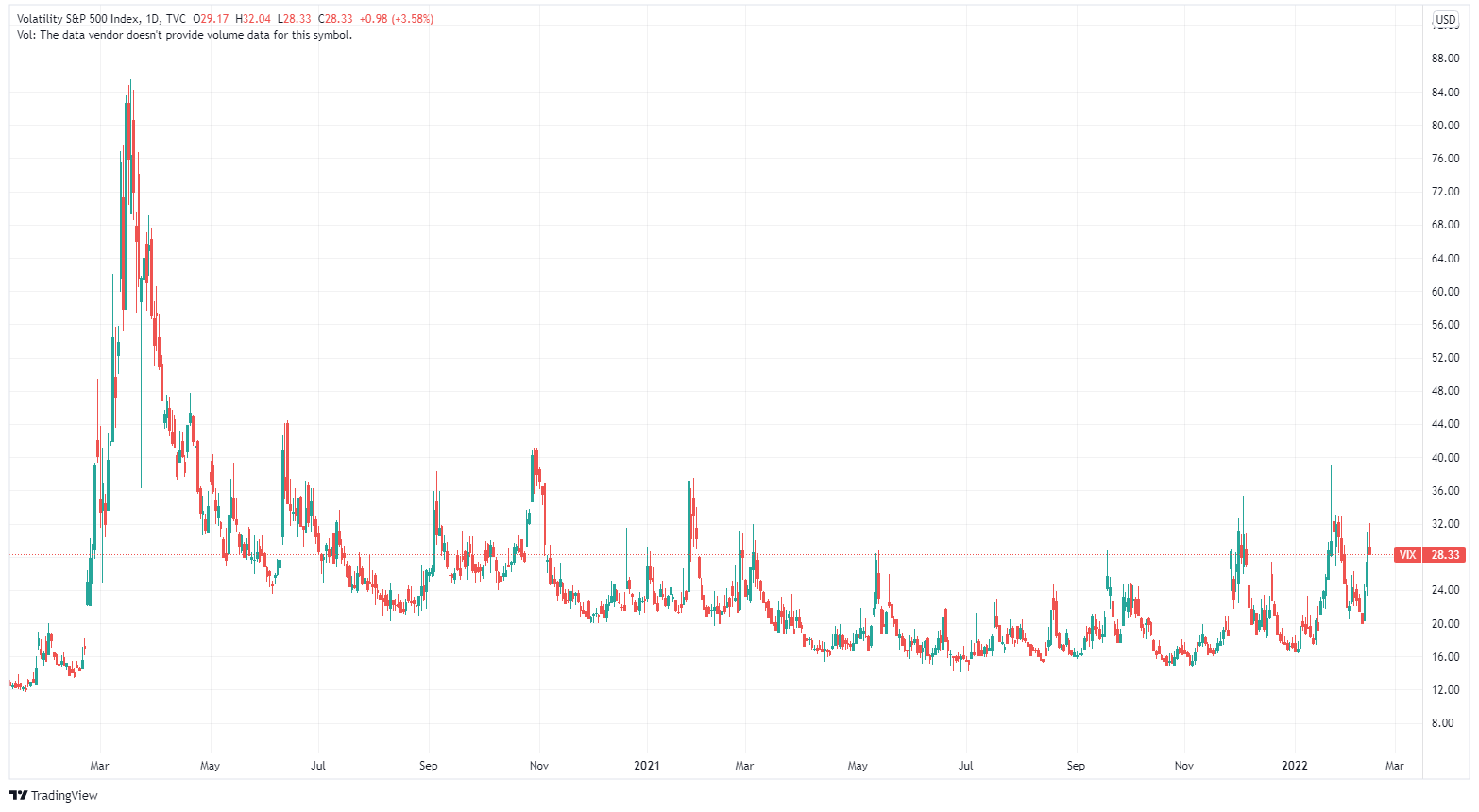Was ich in Bezug auf die traditionellen Finanzmärkte (TradFi) am meisten beobachte, ist der Volatility Index (VIX) - der sogenannte "Fear-Index" - der derzeit bei 28.35 (23.98% in 7 Tagen) gehandelt wird und wahrscheinlich die zukünftigen Tail-Risk-Ereignisse widerspiegelt. Die Spotpreise für Kryptowährungen und der Markt für Krypto-Derivate warten weiterhin auf einen Anstoss.