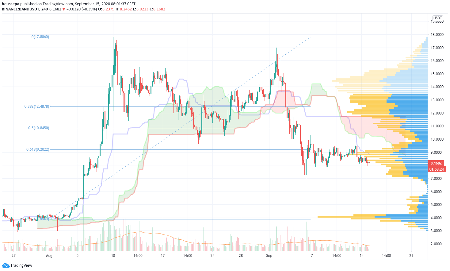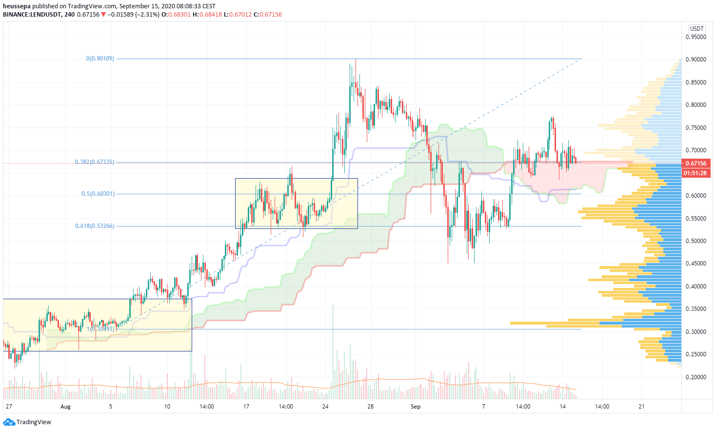 Dieser Token zeigte viel Kraft und eine schöne Erholung. Es findet eine gewisse Redistribution zwischen 0,65-0,70$ statt. Wenn wir dieses Niveau weiterhin halten können, wird die Ichimoku-Wolke bullisch werden und der Preis wird über dem oberen Band liegen. Das ist die Konstellation, die ich sehen muss, bevor ich meine Long-Positionen aufstocke.
