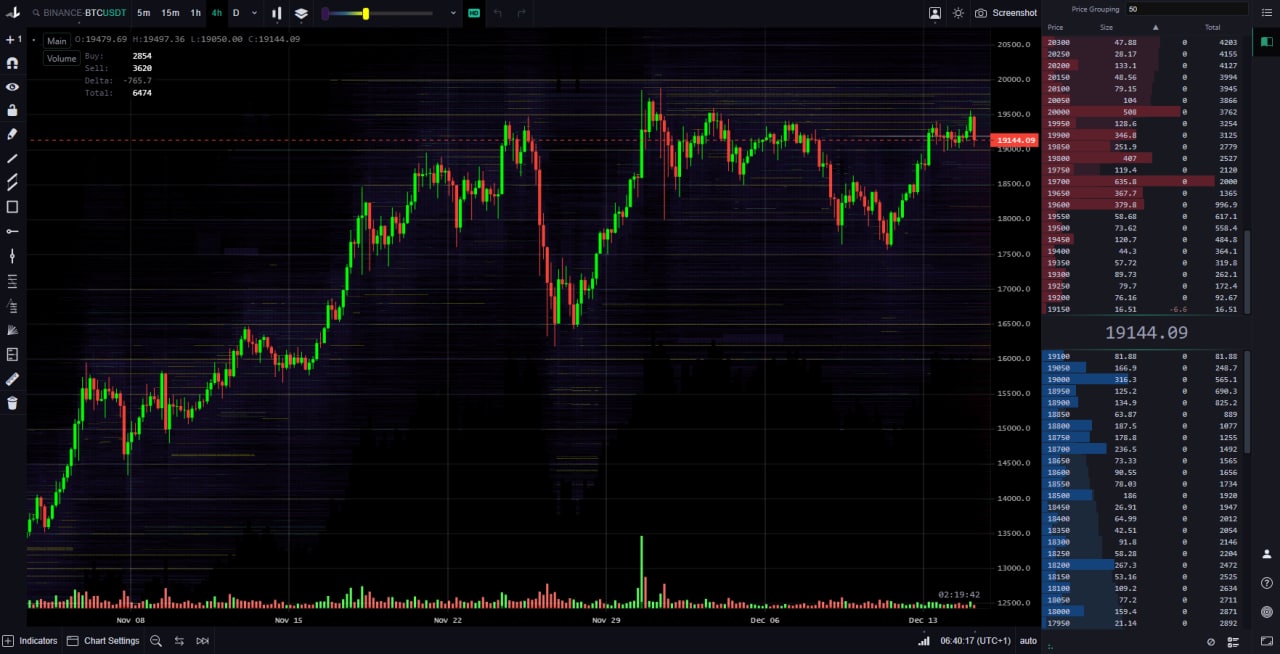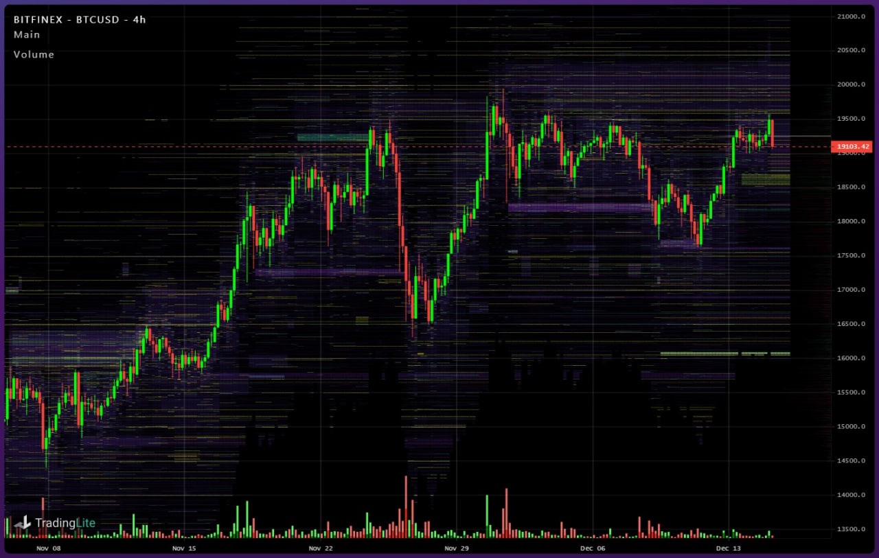Bitfinex, eine Börse, die immer noch eine sehr gute Spot-Liquidität hat, begann einige Cluster oberhalb von 19,5k zu zeigen (Verkaufsaufträge) sowie einige Kaufaufträge weiter unten. Der Cluster auf der Oberseite summiert sich auf fast 2k BTC im Angebot. Je weiter wir nach oben gehen, desto grösser sind die Orderblöcke. Auf der Unterseite haben wir den ersten Cluster bei 19k, mit etwa 750 BTC und weiter unten weitere 1k BTC um 18,5k. Weiter unten gibt es weitere Kaufaufträge bis zur 16k-Marke, die auftauchten, als wir Anfang letzter Woche unter die 18k-Marke gedrückt wurden.