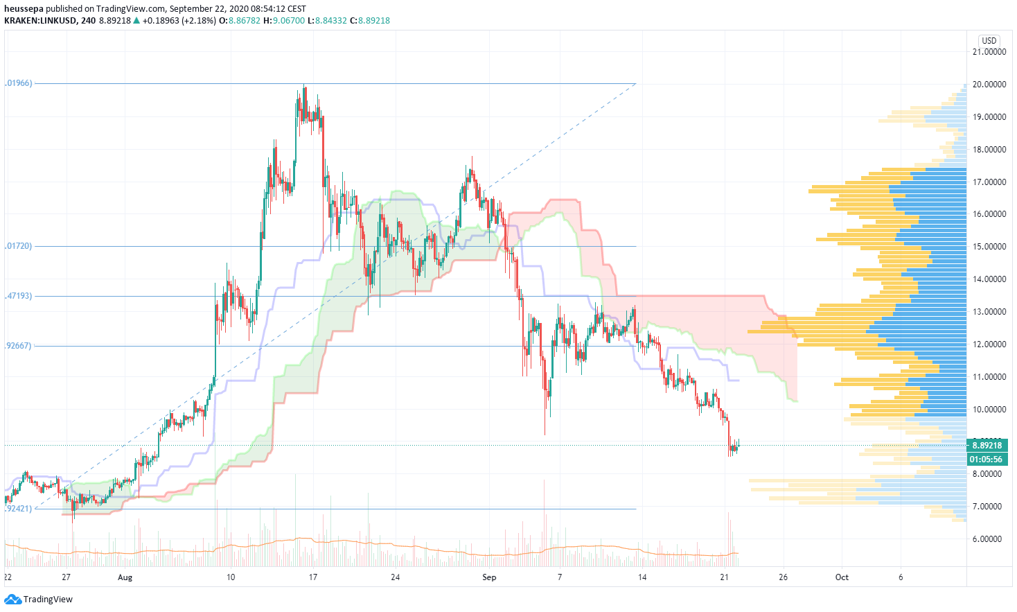 Um 330 $ kommt das 61,8% Fibonacci-Retracement-Level, das zuvor als Unterstützung gewirkt hat. Ich stehe im Moment an der Seitenlinie von ETH$. Wenn wir bei Tagesschluss unter die 330 $-Marke abstürzen, sehe ich die 290 $-Marke als nächstes Niveau, auf dem wir konsolidieren.
