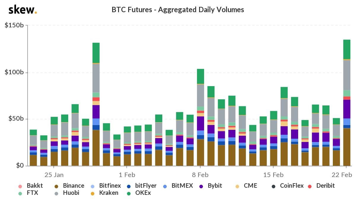 Das gesamte Futures-Volumen von Bitcoin war zu Beginn des Jahres 2021 deutlich höher (im Vergleich zum letzten Quartal des Jahres 2020). Aber wir sahen einen Volumenrückgang zwischen dem 18. und dem 22. Februar. Dies war das zweite Warnzeichen.