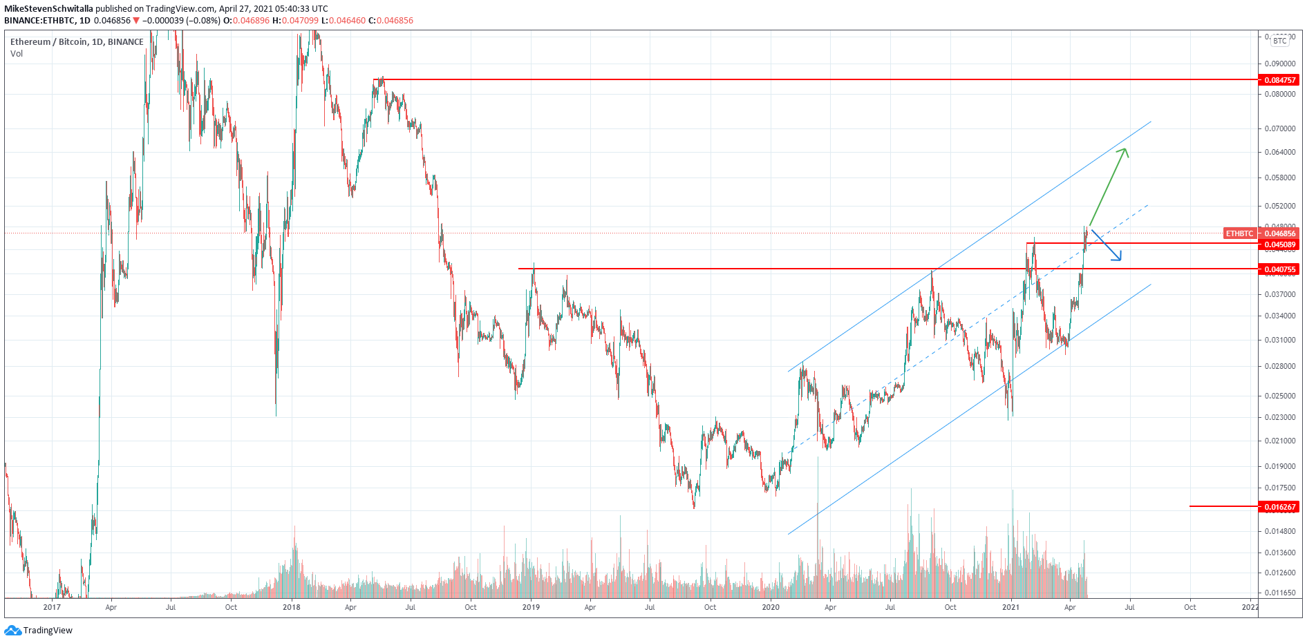 In unserem ersten Chart können wir deutlich sehen, dass sich ETHBTC seit Anfang 2020 in einem Aufwärtstrend befindet. Mit dem erneuten Schwung, den ETH in den letzten Tagen erlebt hat, scheint sich dieser Trend sogar noch verstärkt zu haben. Zudem wurden die wichtigen Widerstände bei 0.04075 und 0.045 überwunden. Was sollte nun einer Kursentwicklung nach oben bis zur Trendlinie 0.070 oder gar in Richtung 0.085 im Wege stehen?