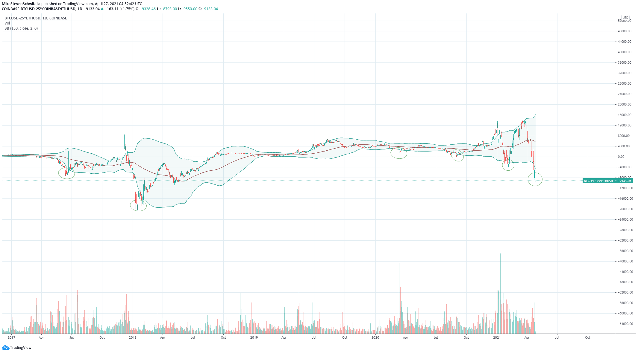 Im zweiten Chart sehen Sie, dass das ETH vs. BTC Verhältnis nicht als Ratio, sondern als lineares Verhältnis (BTCUSD-25*ETHUSD) dargestellt wird. Wenn Sie dieses mit einem Bollinger-Band kombinieren, entstehen interessante Ideen für Handelssetups. Wie Sie sehen können, sind Preise unterhalb des Bollinger-Bandes historisch gesehen interessante Long-Einstiege (und umgekehrt). Im Moment befinden wir uns deutlich unter dem Bollinger-Band, was auf ein kurzfristiges Pullback in ETHBTC hindeuten könnte.