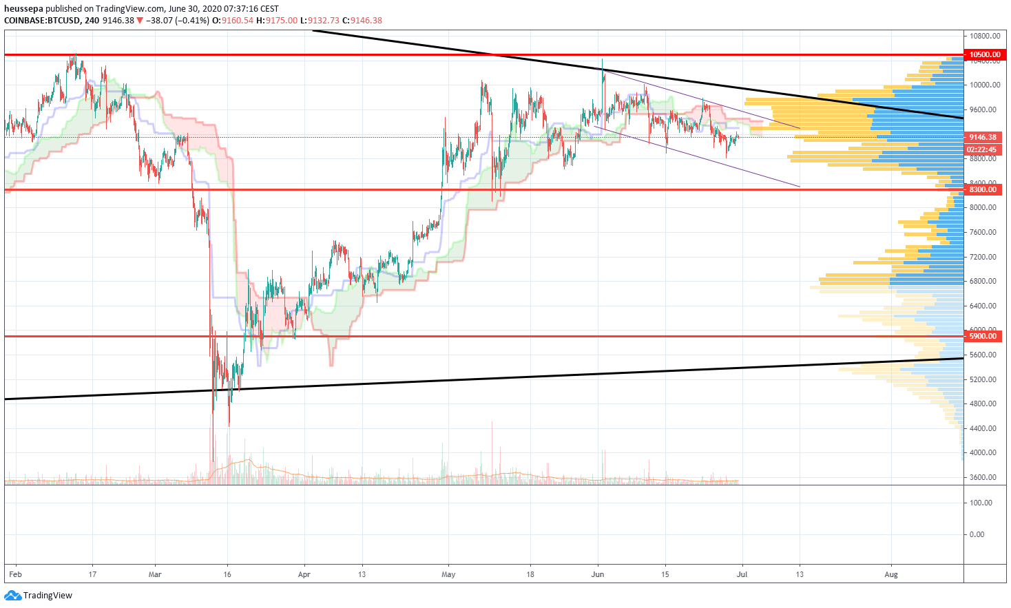 Dieses Bild sieht eigentlich ziemlich sauber aus. Ich glaube, wir befinden uns in einem Abwärtskanal mit einem Kurs unterhalb der bärischen Ichimoku-Wolke. Der Preis befindet sich genau in der Mitte des Kanals, wobei das obere Ende mit dem oberen Band der Wolke konvergiert und das untere Bein in Richtung 8,3k zeigt.