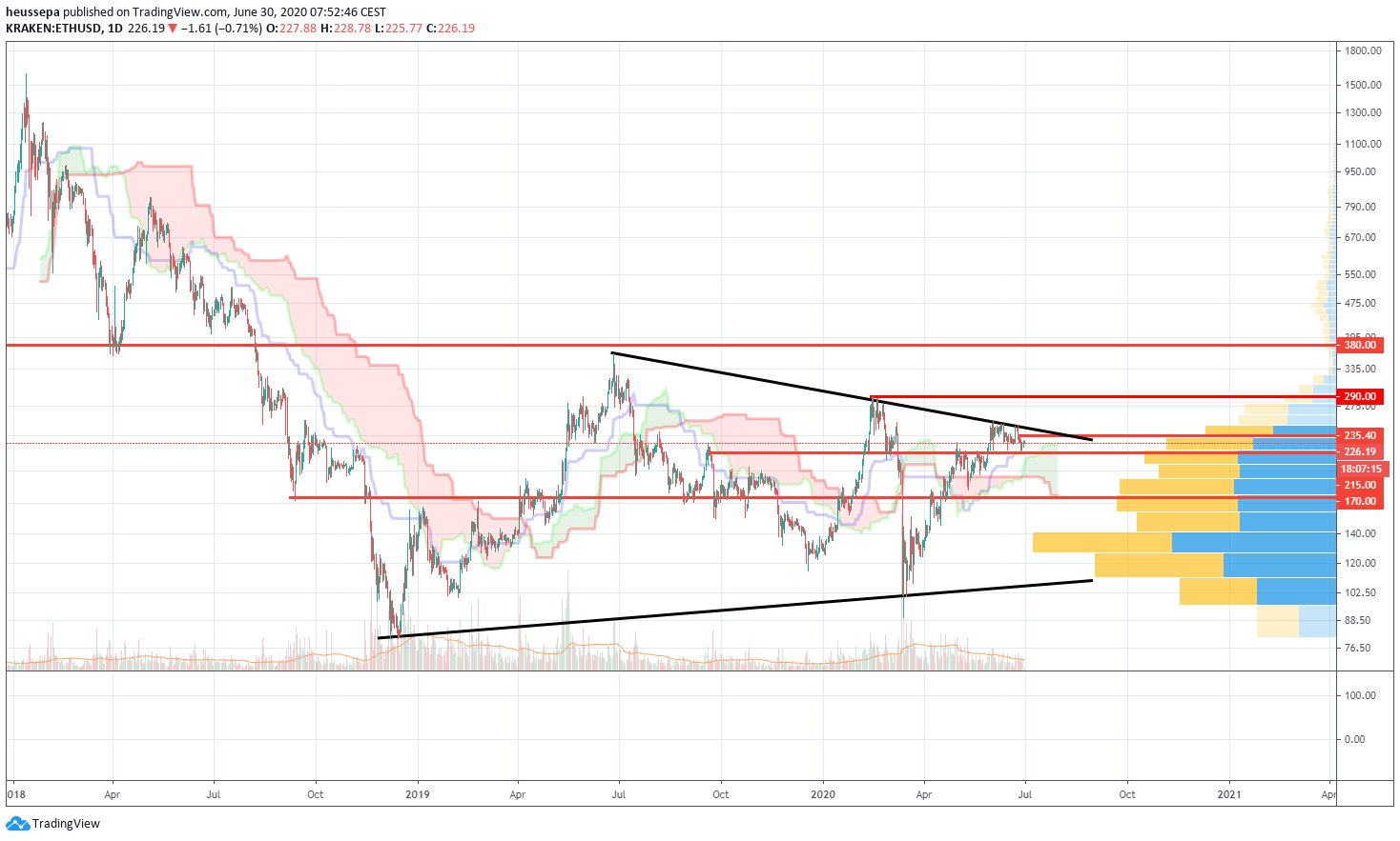 Das Bild hier ist ähnlich wie bei BTC$. Der Preis liegt unter der bärischen Ichimoku-Wolke. Wir prallten von der Unterstützungsmarke von $215 ab. $235 müssen wir herausnehmen, um die bärische Stimmung auszulöschen.
