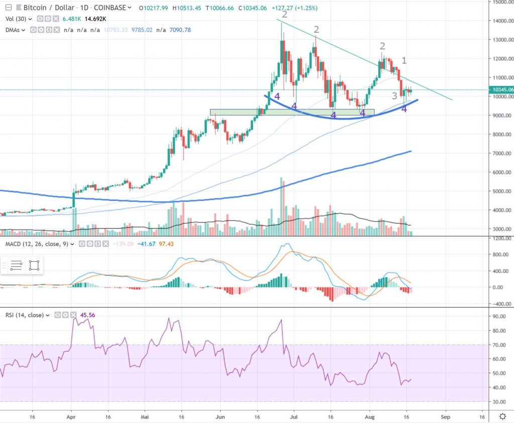 Bitcoin konnte den Ausbruch (1) aus der kurzfristig bärischen Struktur, welche sich durch tiefere Höchstkurse seit Ende Juni auszeichnet, nicht bestätigen (2). Die harsche Zurückweisung um die 12'000 USD Marke hatte einen Test der 100 DMA Durchschnittslinie bei 9'500 USD zur Folge (3). Das Territorium unter 10'000 USD konnte aber schnell wieder verlassen werden und der Preis hat sich aktuell knapp darüber stabilisiert.
