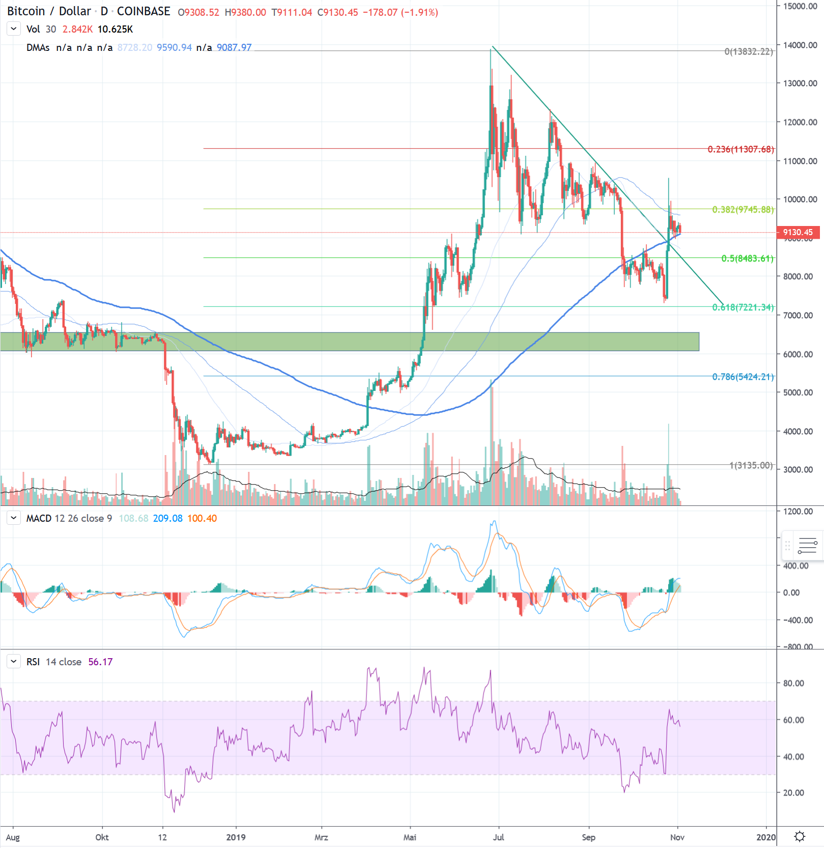 Die eindrückliche Gegenbewegung welche der Bitcoin Kurs am vergangenen Freitag vollzogen hat, ist nun ein bisschen älter als eine Woche. Die Sphären ab 9'700 USD, wo sich auch der 0.382 Fibonacci Punkt befindet, waren starkem Verkaufsdruck ausgeliefert. So pendelte sich der Kurs in der zweiten Hälfte der Berichtswoche knapp über der 9'000 USD Grenze ein. Immerhin auf einem Niveau, welches sich satte 30% höher befindet, als sich die Kurse vor gut einer Woche befanden. Auch behauptet sich der Kurs im täglichen Chart-Intervall wieder über der 200 tägigen Durchschnittslinie. Der seit Juni anhaltende Abwärtstrend konnte durchbrochen werden. Für die Nachhaltigkeit dieser Trendumkehr sind jetzt weitere Bestätigungen nötig.