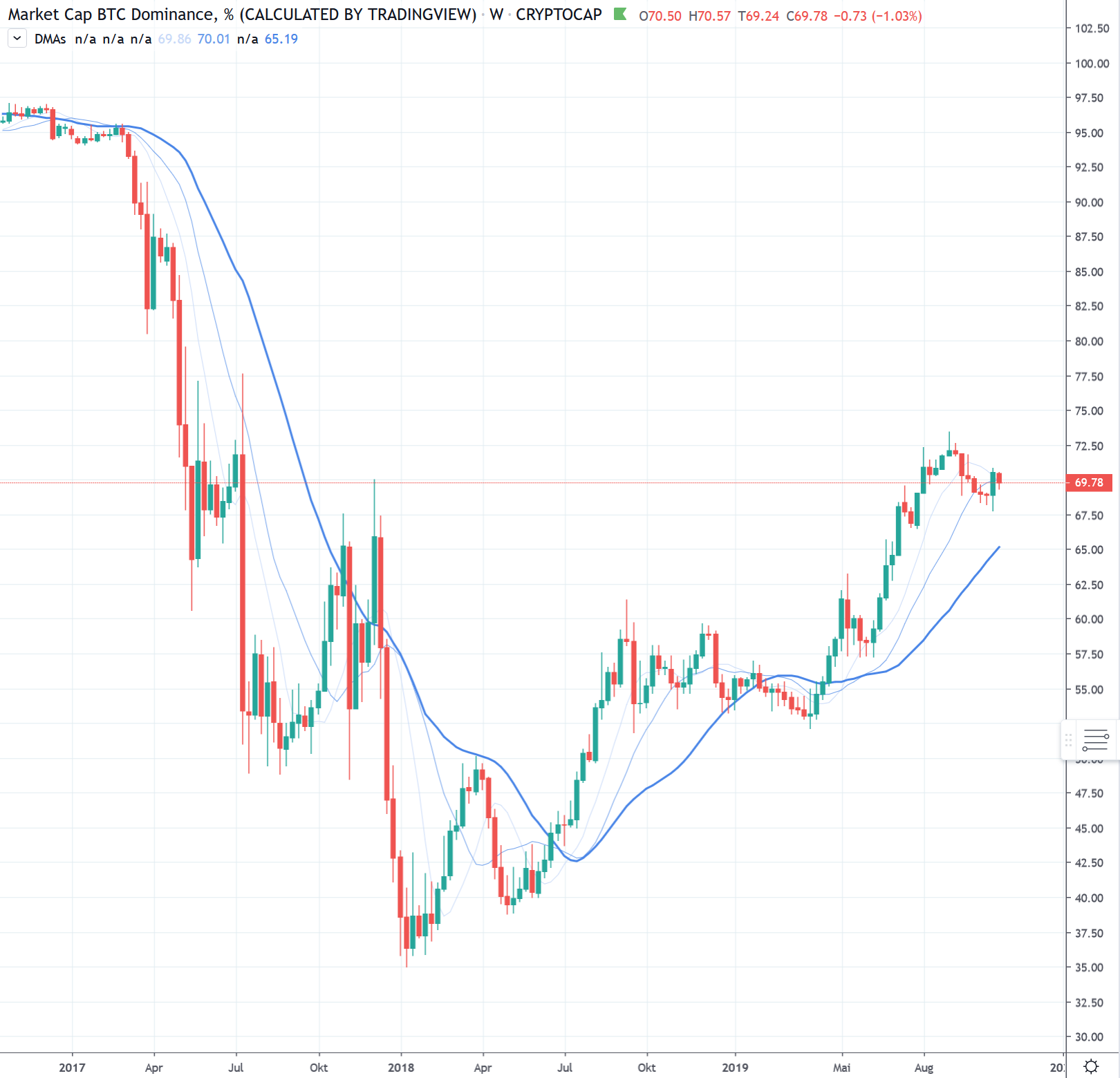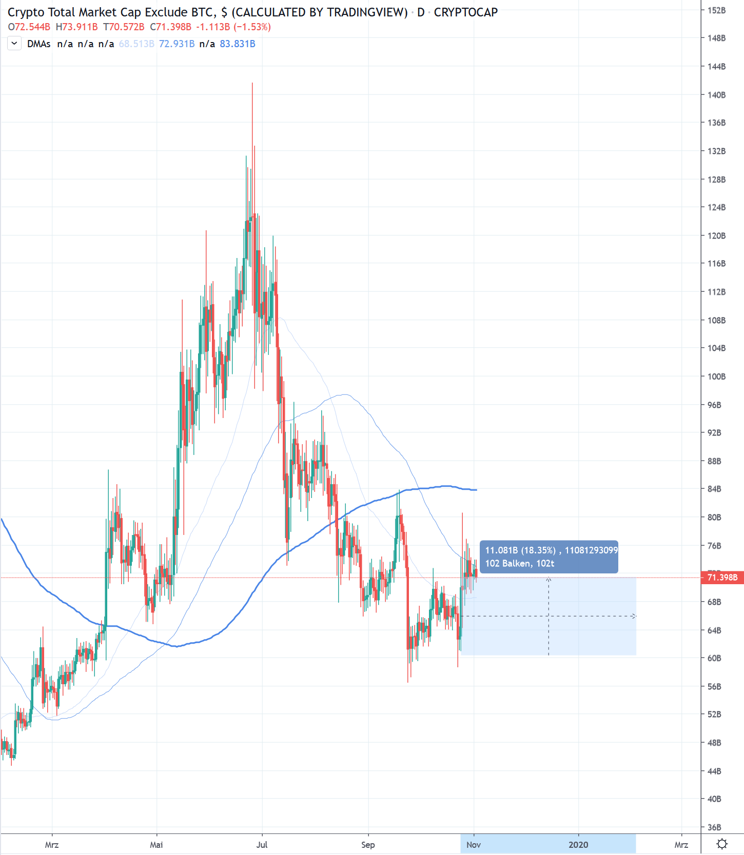 Angetrieben durch den Bitcoin Kurs konnten auch die Altcoins zulegen. Der von Tradingview erfasste Gesamtmarkt ohne Bitcoin, konnte eine Steigerung der Gesamtmarktkapitalisuerung von gut 18% realisieren. Das Feld wurde allerdings von wenigen Token gezogen, die im Umfeld der positiven Nachrichten aus China exponentiell zulegen konnten. Der Gesamtmarkt muss die Zonen um die 76 Mia. USD überschreiten um eine Trendumkehr zu vollziehen. Die Bitcoin Dominanz behauptet sich somit um rund 70% immer noch eindrücklich.